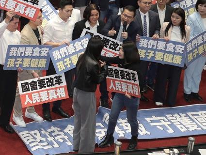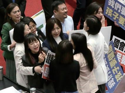 ▲立法院2月20日開議時,國民黨團在議場 杯葛施政報告,國民黨立委徐巧芯(前右)和 民進黨立委黃捷(前左)等多名立委發生推擠 衝突。(中時新聞網資料照/趙雙傑攝)