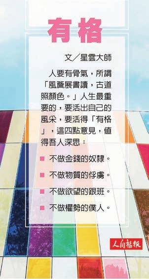 一個人能接受他人意見,具有遠 大眼光,能夠勤勞耐苦,懂得靈巧 通達,他的心靈會有一番體悟,生 命也必定有不斷的活水源頭。為人 之要有以上這四點。