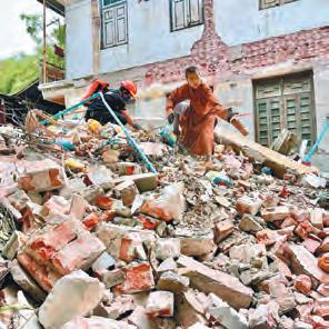 6日,救援團隊深入重災區域,廢 墟中的生命景象令人動容。倒塌的磚 牆旁,僧侶們正將碎裂的瓦礫重新壘 砌;臨時搭建的竹棚下,沙彌們仍保 持著課誦儀軌;災民等候Dr. Chin醫 生及醫療人員進行診療、敷藥,陳慶 華教授及林琪佩醫生也為傷者病患進 行義診,緬華楊氏姐弟協助做翻譯, 救援隊隊員則在旁協助。