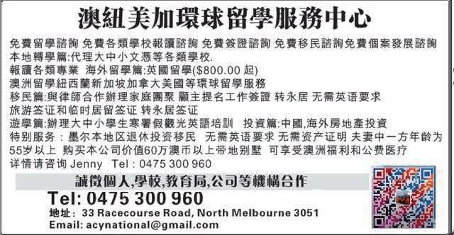 ★ 免 費 留 學諮 詢 ★ 免 費 報 讀學 校 諮 詢 ★ 免 費 簽 證諮 詢 ★ 收 費 個 案規 劃 諮 詢 本地轉學篇:代理大中小學文憑學位各類學 校,報讀大學基礎課直升大學一年 級,報讀大學文 憑 課程直升大學二年級,幼教一年的文憑課程是移民的熱門課程,解決學生出勤率不夠等簽證問題 海外留學篇:英國留學($1500 起)。澳洲、新西蘭、新加坡、加拿大、美國等國環球留學服務 遊學篇:辦理大中小學生寒暑假觀光英語培訓 工作簽證:打工度假簽證、轉工作簽證,與移民代理合作 永居簽證:旅遊簽證、457 工作簽證轉永居,家庭團聚、雇主提名、配偶簽證轉永居簽證 特別服務:學生簽證等臨時居留簽證、投資商業轉永居,免年齡限制,免英文要求 詳情請電 Jenny 電話或微信 0475 300 960