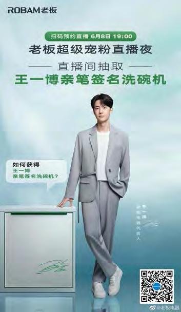 自5月28日官宣王一博代言以 來,巨大的流量便湧向老板電器和 洗碗機。同時,抖音上,官宣王一博 為代言人的話題#寵愛從雙手開始 也獲得了廣泛關注和討論。