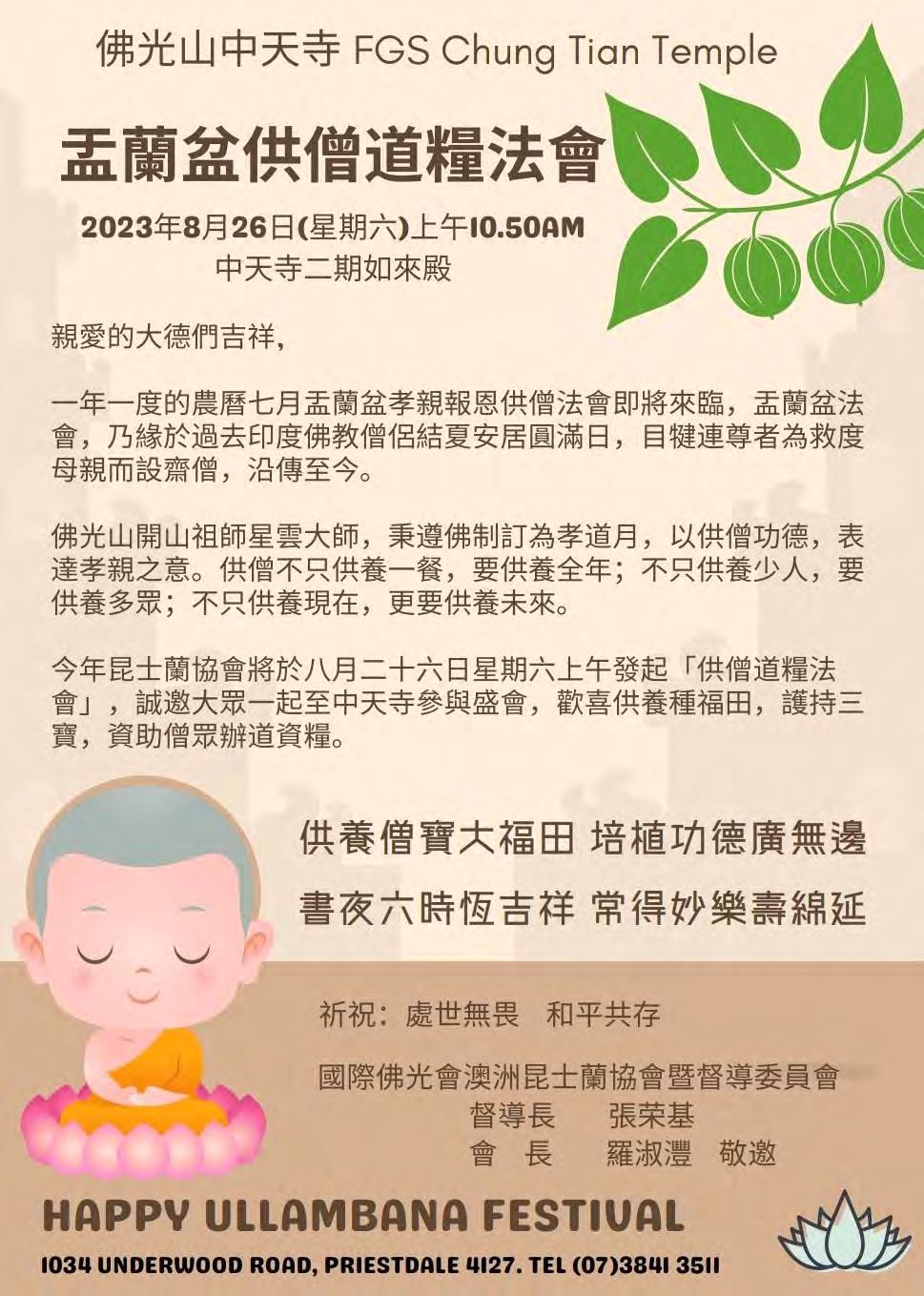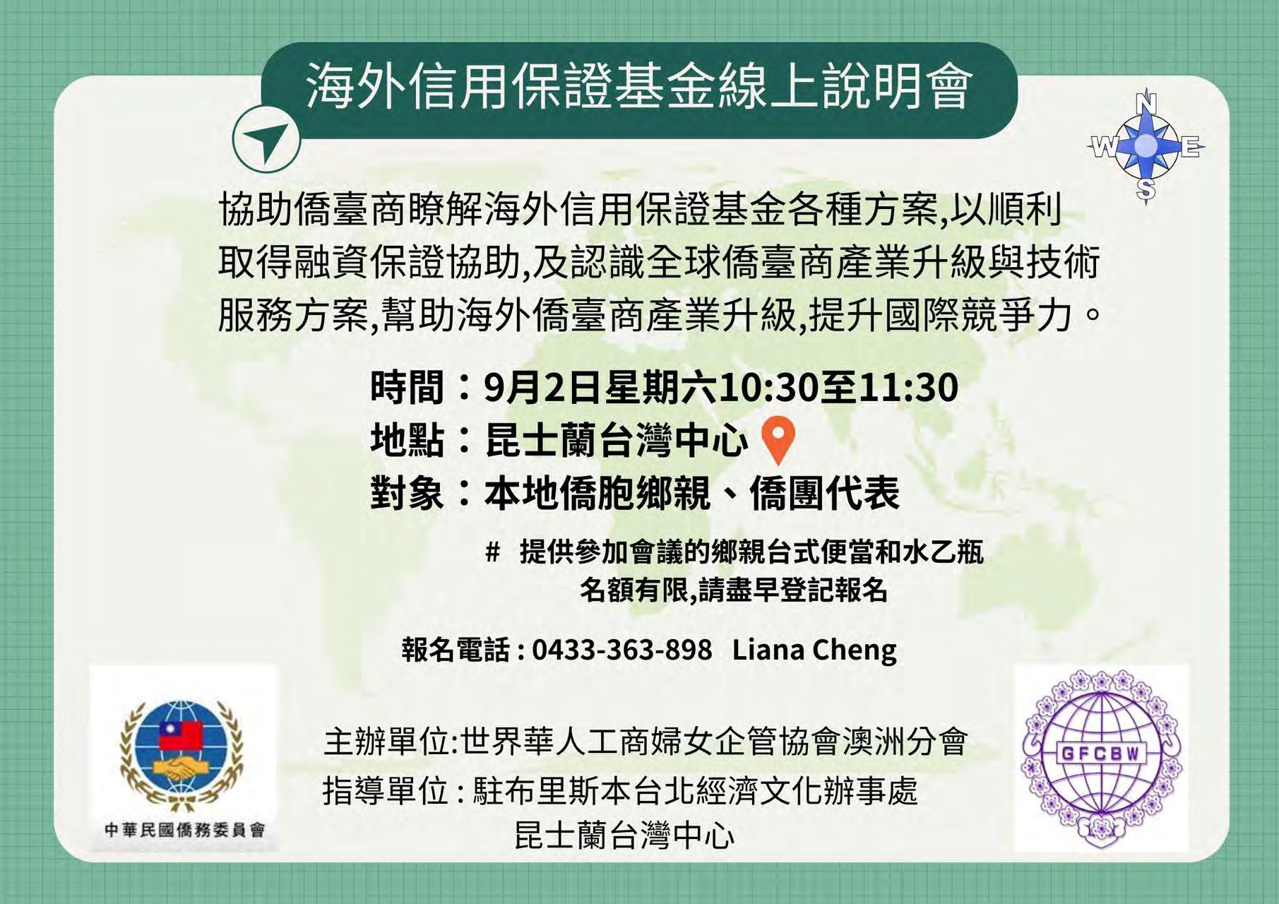 昆士蘭日報 QueenslandChineseTimes 10 Friday,Saturday25,26Aug2023 澳洲新聞 AUSTRALIANNEWS 30 聯絡人:Jessie Liu: 0434868623 / Mimi Chang: 0413548899 (請盡量採取簡訊聯繫方式) 暨⽉圓⼈團圓的中秋節慶 主辦單位: 昆士蘭台灣慈暉婦女聯合會 指導單位: 昆士蘭台灣中心 17 September (Sunday) 慶祝昆士蘭台灣慈暉婦女聯合會 Start at 6:00pm 周年 ⾛過新移⺠史30年的慈暉感恩餐會 歡迎所有社團及各界⼈⼠踴躍參加! 地點:Sunnybank Plaza 楓林大酒樓 $80/每位貴賓 9月8日之前給予確認,感恩! 贊助單位: 駐布⾥斯本台 經濟⽂ 辦事 昆士蘭日報 QueenslandChineseTimes