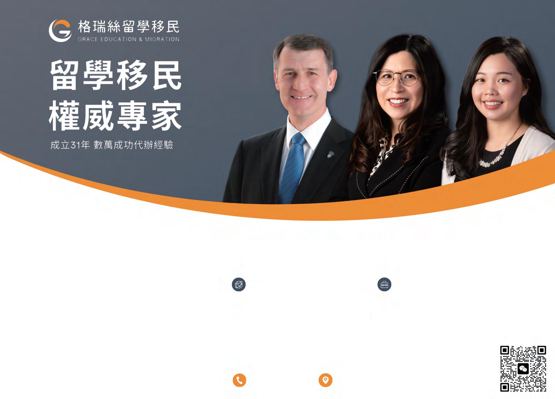 格瑞絲留學移民成立於1994年,成立旨於事門為留 學、遊學與移民澳洲的學生及家長做全方位的專業諮 詢,格瑞絲除了提供高水準專業諮詢外,也讓顧客體 會格瑞絲更多贴心、親切、迅捷的服務。 格瑞絲留學移民設立於澳洲布里斯本,提供您最方便 的澳洲在地服務。不管您是在哪裡,都可以透過網 路、電話、 通訊 软件等來完成所有的 諮 詢及辦理手 續。抵澳後有任何學業及簽證問题,都能得到最即時 的回覆及解决辦法。讓你在澳洲留學移民的路上不孤 單!