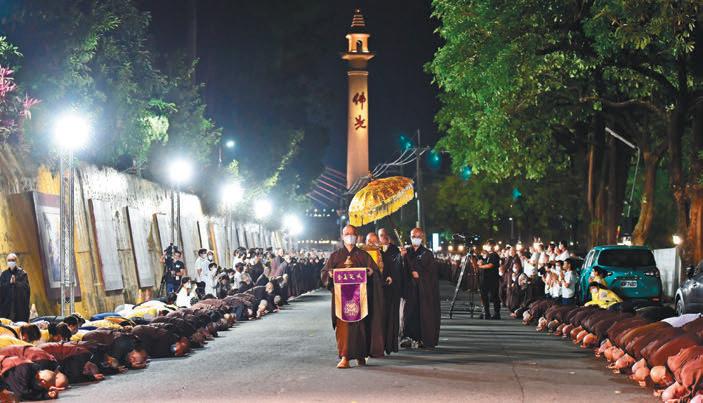 弟子夾道跪接,一路從問道塔至萬壽園,綿 延一公里叩首恭迎舍利回山、場景殊勝。 接著由心保和尚,退居和尚心定和尚、心 培和尚三師主法奉安儀式,率僧信二眾誦持 〈大悲咒〉、〈變食真言〉、〈佛光讚〉等 聖號,將誦經功德回向星雲大師。奉安儀式 壇場以蘭花、桔梗花等鮮花、素果布置而成 ,會場莊嚴、隆重。