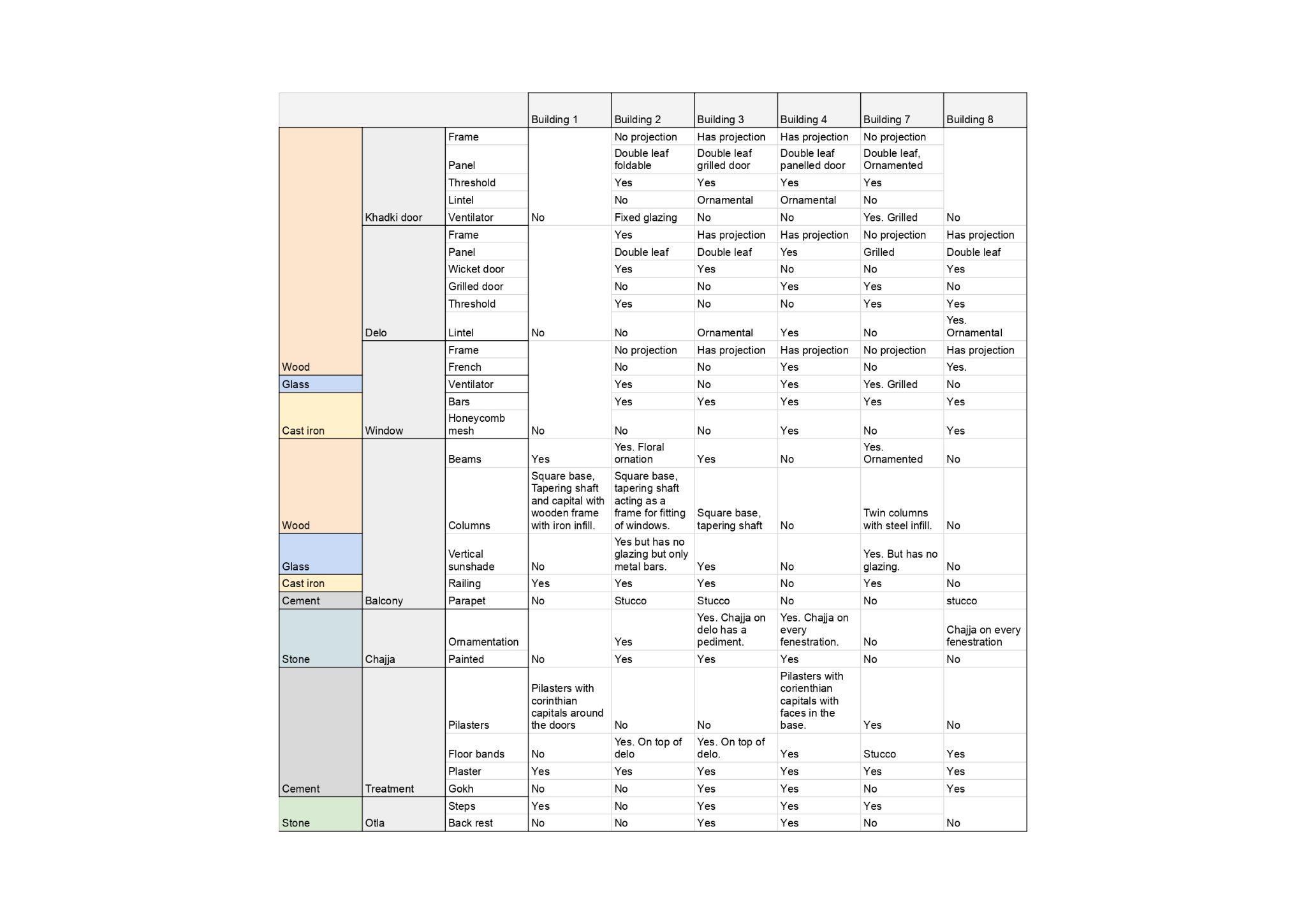 The mind map provided me with a range of questions I could look at. And I personally enjoyed the whole process of annotating photographs. While sketching, I had filtered out a lot of details and captured overall proportion and a sense of composition in the facades. Through annotating photos, I started noticing details that I had overlooked while drawing on site. I never realized how the act of consciously annotating the photos can help us notice new details and change the way we think. Making the visual matrix across the common elements was the icing on the cake. That opened up me to a whole new set of observations, which I did not have while drawing each of them individually.