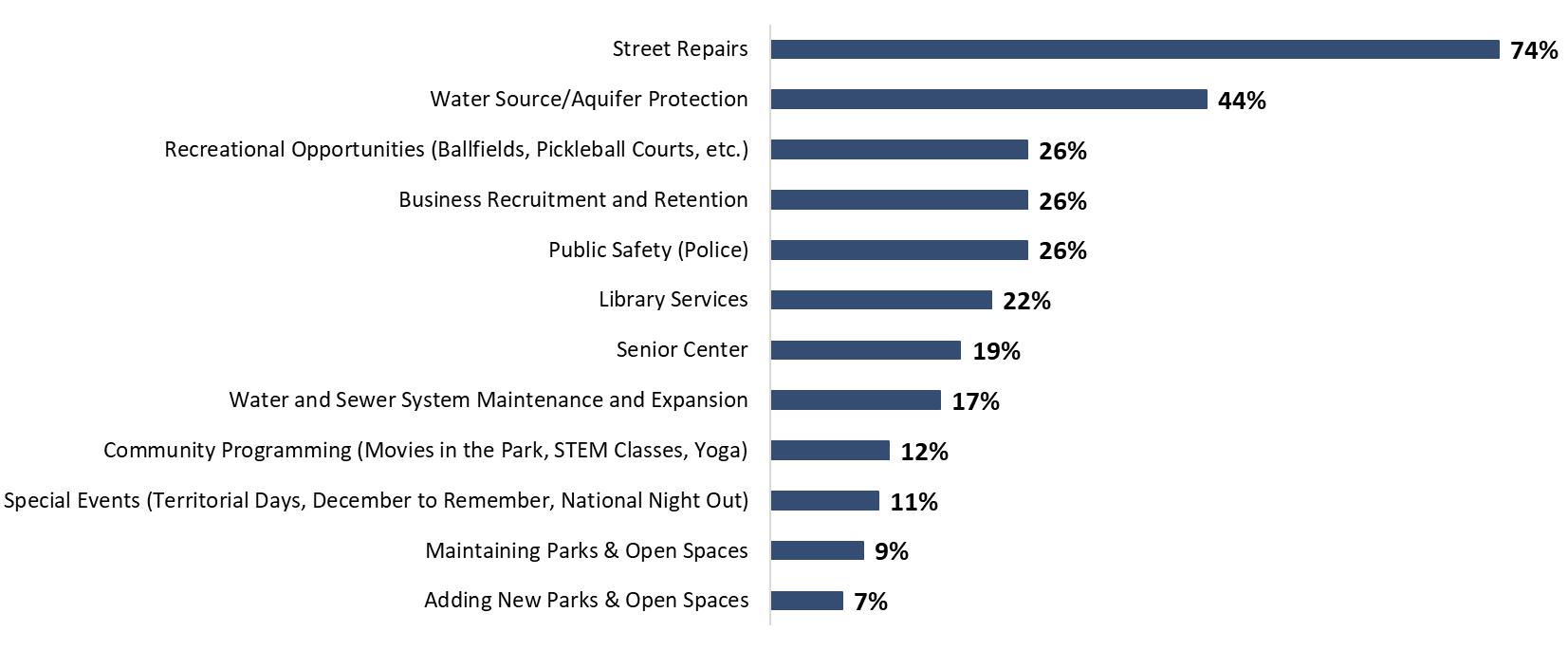 • Street Repairs are by far the top community priority (74% of respondents).