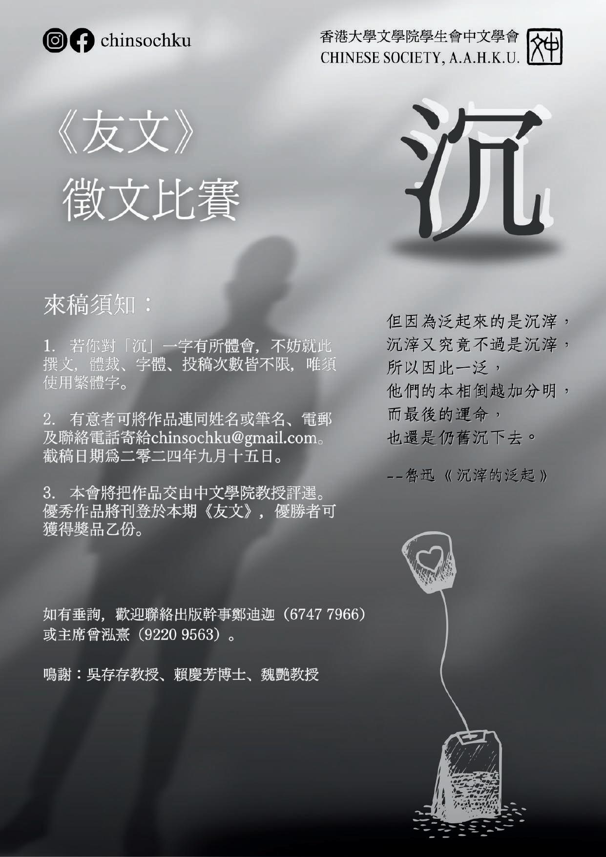 學術成份重▗尤其講座這類互動性低的活動,往往難以擺脫參與 人數較少之命運▘幸得莊友配合製作宣傳海報▗盡責地進行Class Announcement並努力為講座宣傳,以致Googleform報名人數能 有效增加,實際參加者亦較預期人數多▘同時,由衷感激出席所有或 大部分講座的莊友,感謝他們正値三▗四月繁忙的期中考試期間仍願 意抽空協助籌備講座及親身支持,甚至適時加以鼓勵及提醒,令講座 能減低不足之處▘記得中史講座在開始前兩分鐘連接電腦的HDMI線 突然爛掉導致投影機無法正常運作▘當刻尙處於焦慮和驚恐,而莊友 卻已立刻行動聯絡相關部門,快速解決問題避免講座延誤▘正因他們 的支援,彌補我作為籌委會主席的不足,講座方能舉行順利▘能親自 籌辦活動,為同學增加學習知識的機會,促進學術交流確實榮幸,還 望參加同學享受講座▘