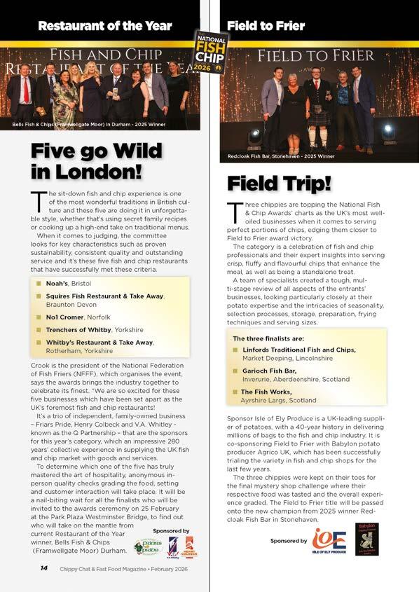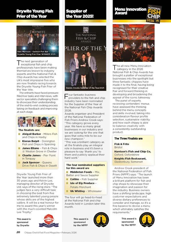 Wehave an exciting edition for this February. Inside we have listed all award catergories with all the finalists for the NFFF National Fish & Chip Awards 2026. The event is held at the Westminster Plaza, London on February 25th. It is one for all shops and suppliers not to miss, and there are only a handful of tickets left. The awards are hosted by TV’s Stephen Mangan who has starred in Alan Partridge, The Green Wing, The Split. He is also an accomplished broadcaster and stage actor. All shop owners are welcome to attend. For further ticket details visit thefishandchipawards.com.