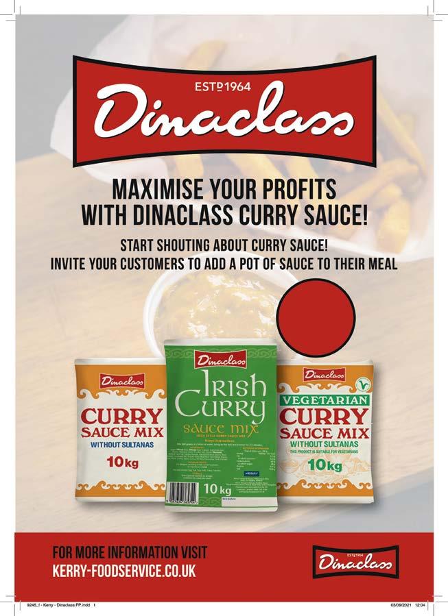 Fish and chips may be Britain’s undisputed national dish, but hot on its heels comes curry. And with National Curry Week taking place from 6th-12th October, fish and chip shops have the perfect opportunity to bring the two together with one simple, costeffective ingredient - Dinaclass Curry Sauce. This much-loved sauce, which bridges the gap between classic British and Indian culinary traditions, is not only the perfect companion to a portion of fish and chips but also a smart way to extend menus with innovative options themed for the occasion. From curry saucetopped burgers to loaded curry chips with toppings such as cheese, chicken, or even doner meat, these creative offerings entice customers into trying something new while enjoying the comfort of a familiar flavour.