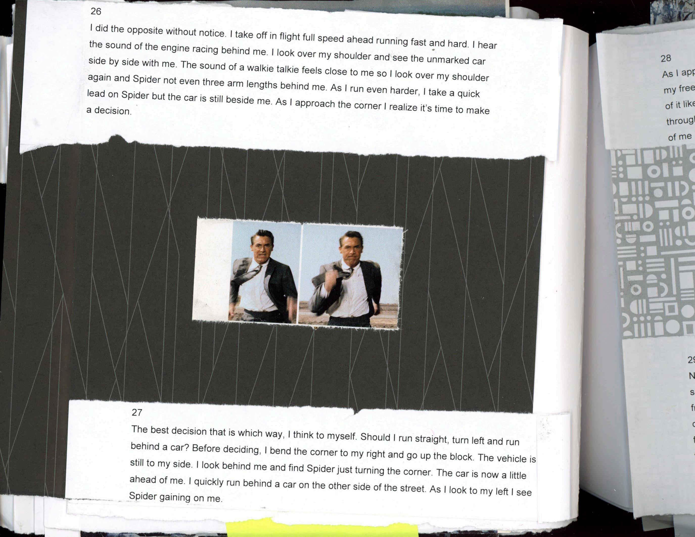 I did the opposite without notice. I take off in flight full speed ahead running fast and hard. I hear the sound of the engine racing behind me. I look over my shoulder and see the unmarked car side by side with me. The sound of a walkie talkie feels close to me so I look over my shoulder again and Spider not even three arm lengths behind me. As I run even harder, I take a quick lead on Spider but the car is still beside me. As I approach the corner I realize it’s time to make a decision.