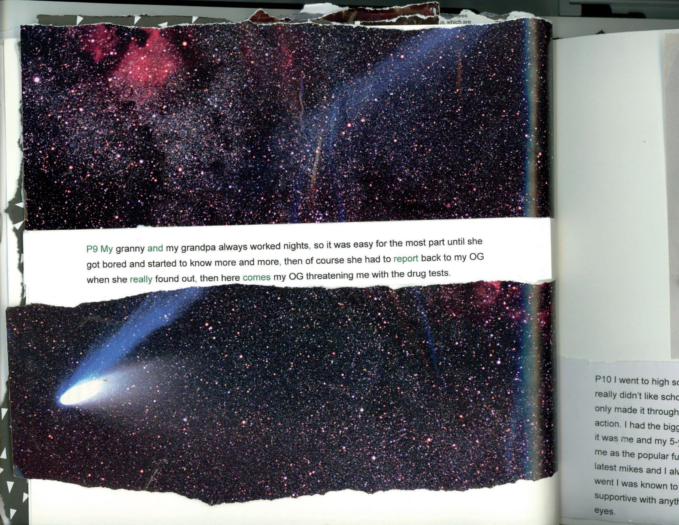 While each author’s text is solely the work of the Author, the image used to create this book’s illustrations have been sourced by various print publications. Authors curate these images and then, using only their hands, manipulate the images through tearing, folding, layering and careful positioning. By applying these collage techniques, Authors transform their written memoirs into illustrated books.