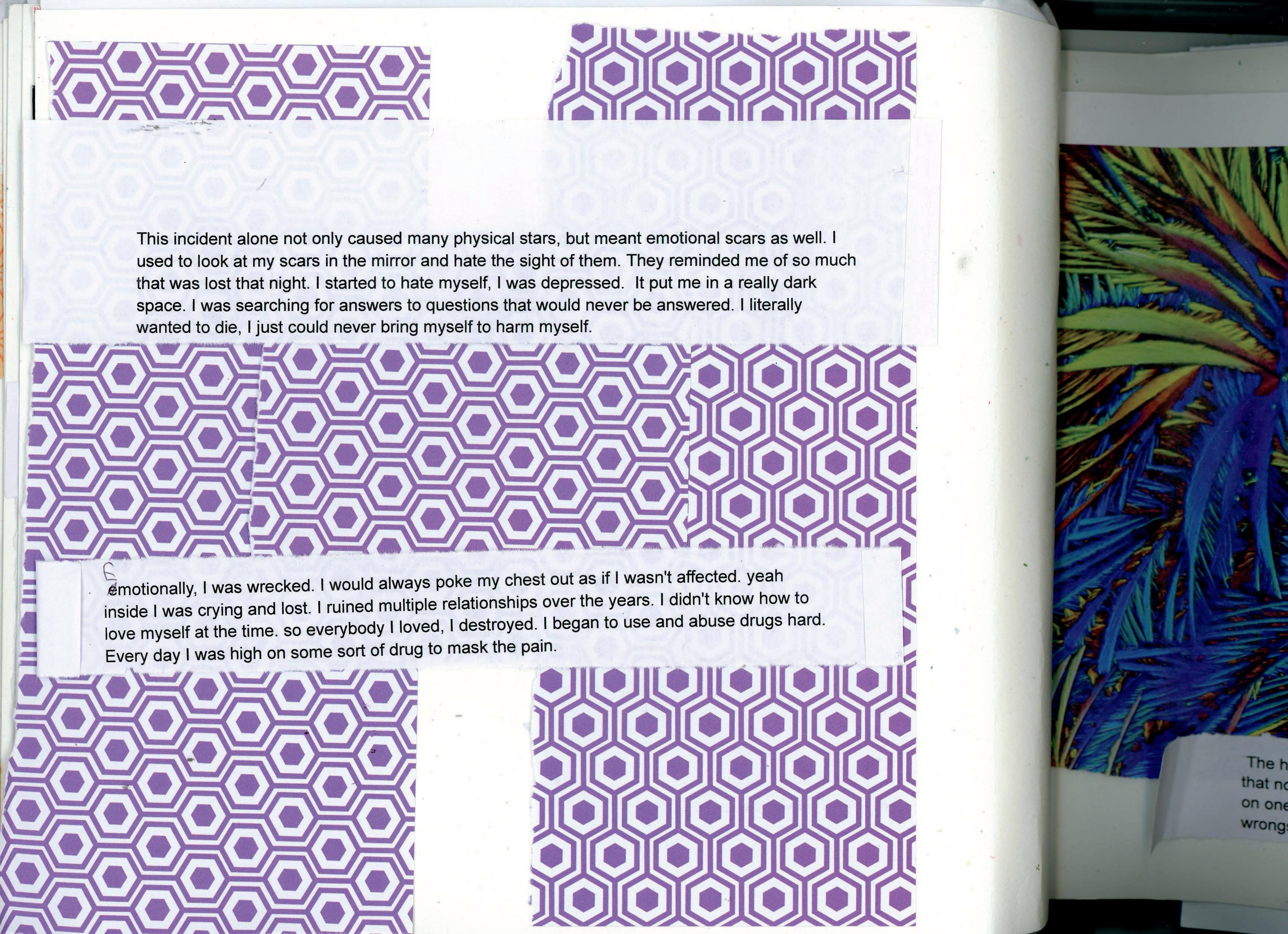 This incident alone not only caused many physical stars, but meant emotional scars as well. I used to look at my scars in the mirror and hate the sight of them. They reminded me of so much that was lost that night. I started to hate myself, I was depressed. It put me in a really dark space. I was searching for answers to questions that would never be answered. I literally wanted to die, I just could never bring myself to harm myself.
