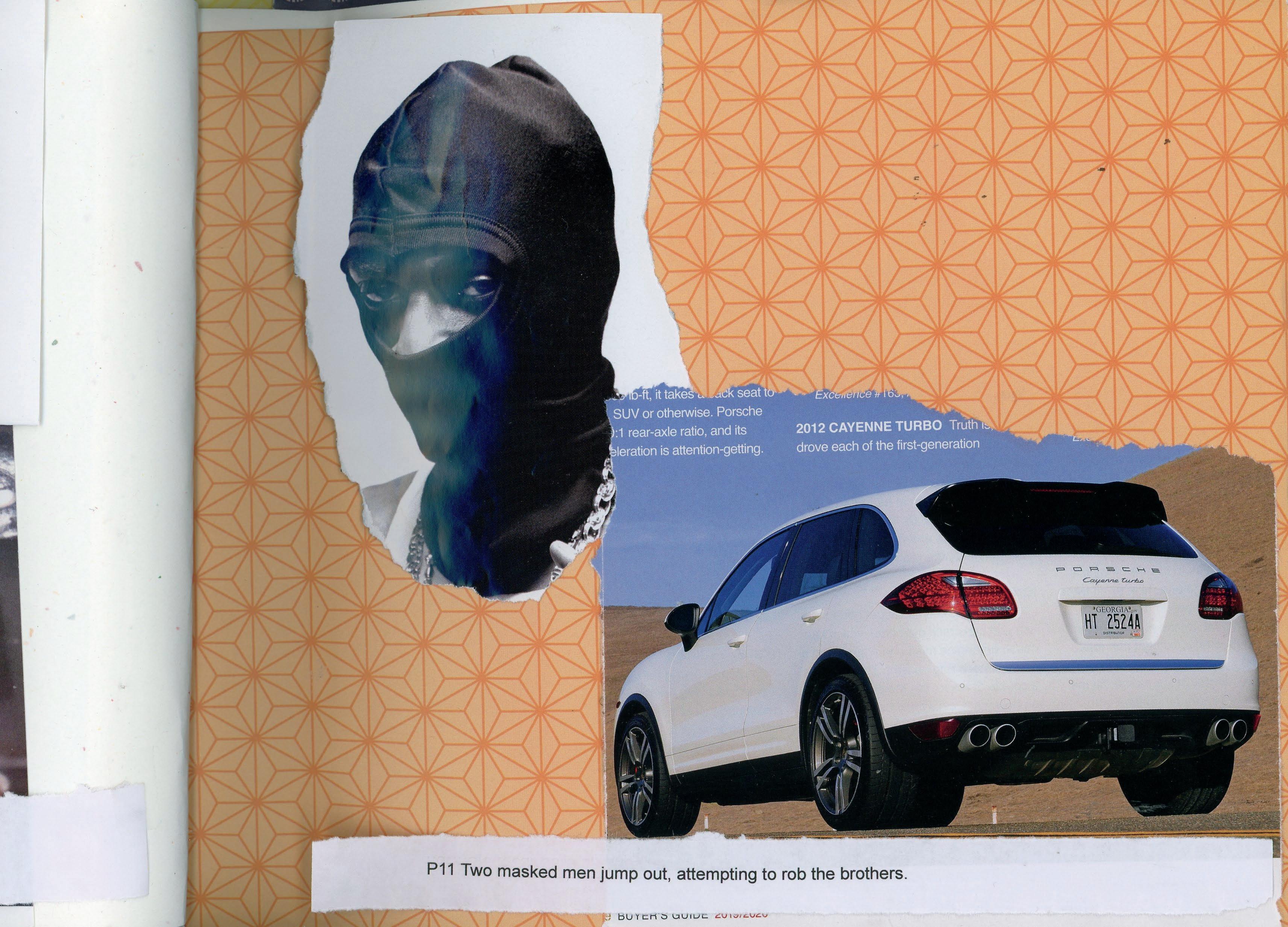 Two masked men jump out, attempting to rob the brothers.