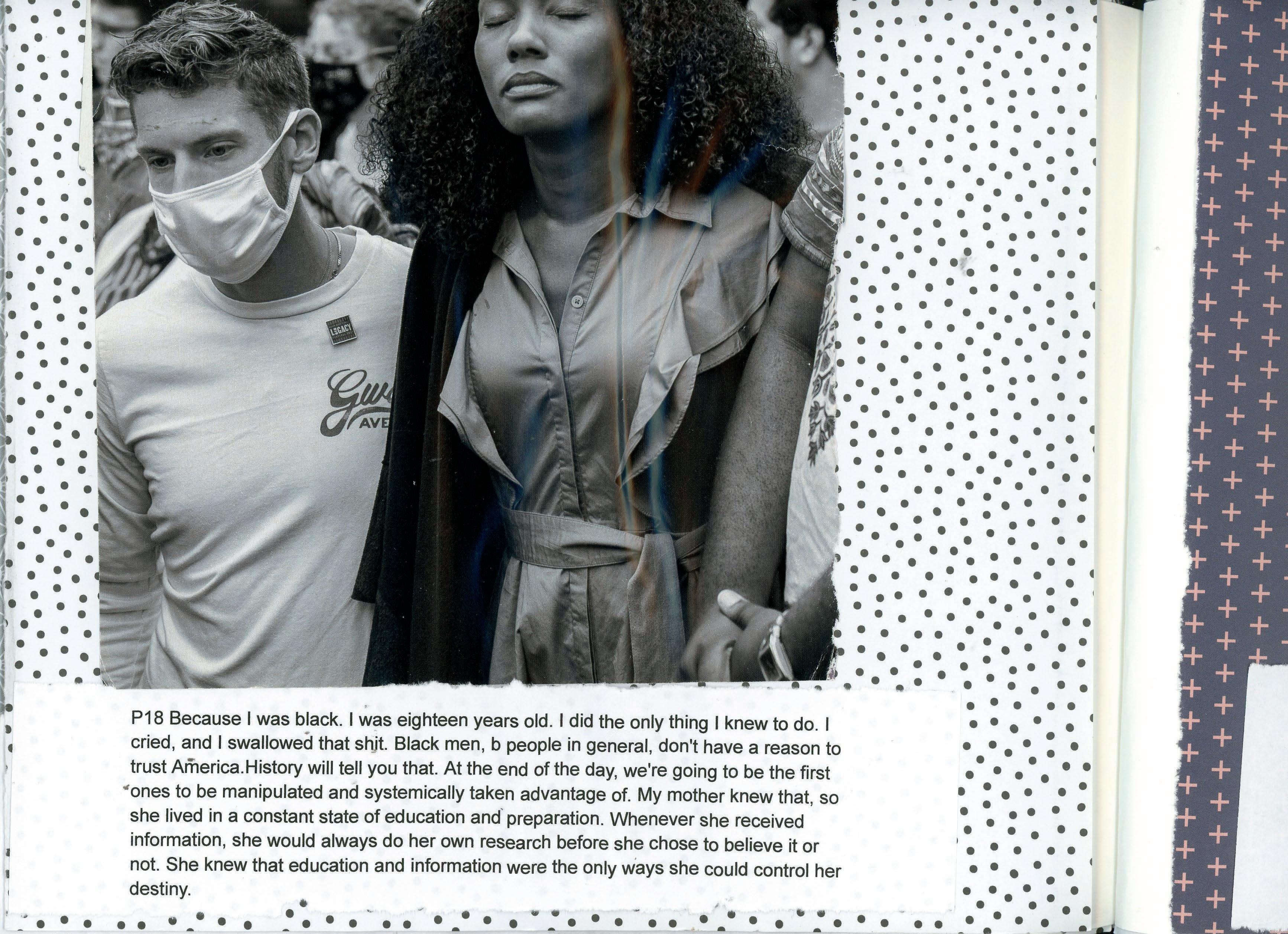 Because I was black. I was eighteen years old. I did the only thing I knew to do. I cried, and I swallowed that shit. Black men, b people in general, don't have a reason to trust America.History will tell you that. At the end of the day, we ' re going to be the first ones to be manipulated and systemically taken advantage of. My mother knew that, so she lived in a constant state of education and preparation. Whenever she received information, she would always do her own research before she chose to believe it or not. She knew that education and information were the only ways she could control her destiny.