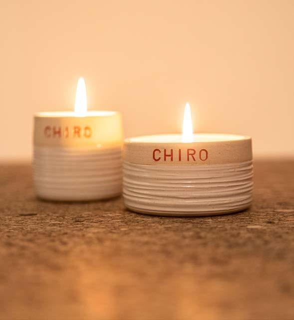 elkaar. Het resultaat? Twee sfeervolle en handgemaakte Chirokaarsen, gerealiseerd met materiaal van De Banier. CHIROKAARS HOOG (circa 75 mm doorsnede en 55 mm hoog) 12,95 EURO CHIROKAARS BREED (circa 95 mm doorsnede en 50 mm hoog) 14,95 EURO Lieve (specialiste keramiek, De Banier Gent) maakte prachtige potjes. Mie (auteur ‘Koken met kaarsen’, De Banier Antwerpen) goot sfeervolle Chirokaarsen.