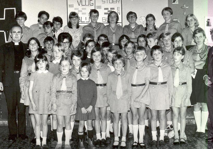 ‘De reusachtige grijze kuip van het Antwerp-stadion was omgetoverd in iets dat aan een enorme kelk van een bloem deed denken. De hoofdkleuren waren blauw en bruin: blauw van de meisjesuniformen, bruin van de jongenshemden ... Het werd nog vrolijker toen vlaggen en wimpels op het middenveld verschenen: geel, blauw, wit, zwart, rood ... Het was een feest als een vlam! Een massale gebeurtenis van modern, jong kristendom.’