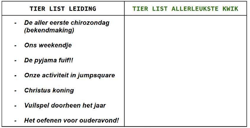 Koekoek lieve vriendjes! Het is weer tijd om te bladeren in het tofste chiro tijdschrift dat er op de hele aardknol bestaat! Laat het nu net zo zijn dat jullie zijn aangekomen op de tofste pagina van onze Chiroepie ;). Om jullie te tonen dat ook wij, als jullie leiding, een enorm tof jaar aan het beleven zijn hebben we een kleine tier list gemaakt met onze leukste momenten tot nu toe!