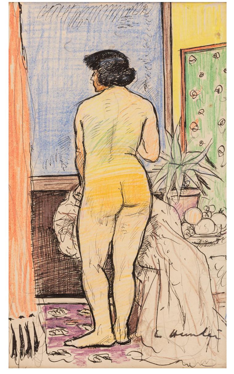 Nude Standing by a Green Screen signed ‘L Hunter’ (lower right) crayon, pen & ink