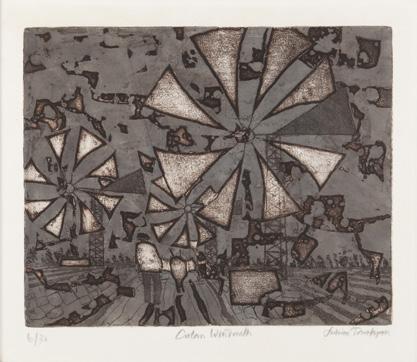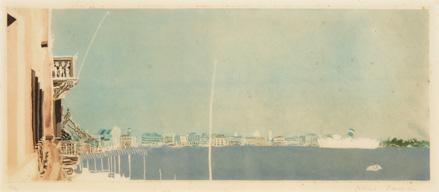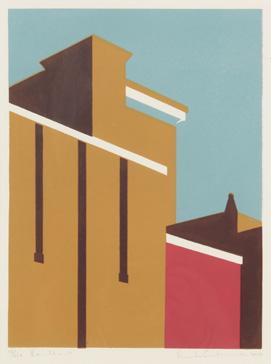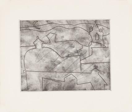 In 1916 as imposed conscription came into force, Wadsworth enlisted in the Royal Naval Volunteer Reserve. He was sent to Greece and stationed on the island of Lemnos, where he worked analysing aerial photographs. Riponelli: A Village in Lemnos was based on studies made during this period. The print exemplifies Wadsworth’s Vorticist style, transforming the Mediterranean village into a dynamic composition of precariously balanced houses arranged across hilly terrain. Sharp walls and angular windows collide and interlock, forming a dense configuration of geometric forms that convey both structure and instability.