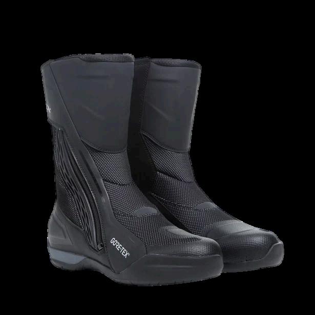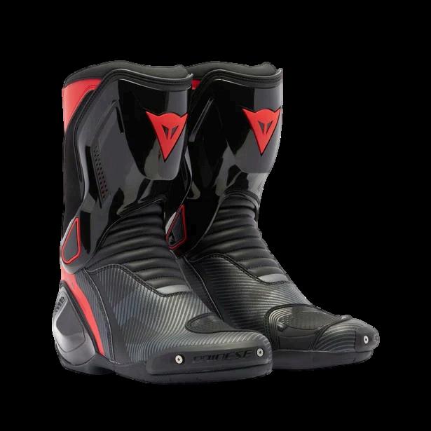 DStivali moto sportivi con sistema Axial Distorsion Control System per la protezione della caviglia e slider termoplastici sostituibili.