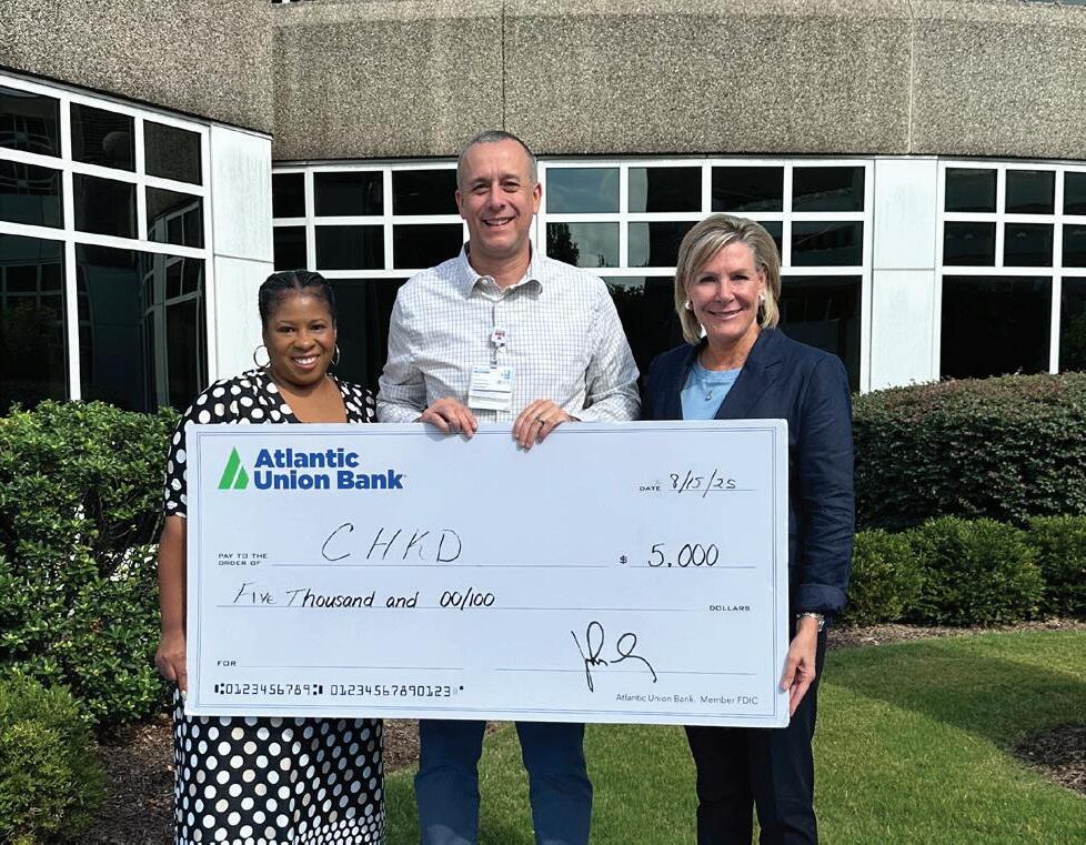 Atlantic Union Bank – “a local bank that cares” – has recently partnered with CHKD to provide ongoing support for our patients and their families, fulfilling the bank’s promise of enriching the lives of the people and communities they serve. Shown here, Atlantic Union Bank’s Latisha Brown (left) and Lisa Morgan (right) present this year’s $5,000 donation to CHKD’s John Muszkewycz.