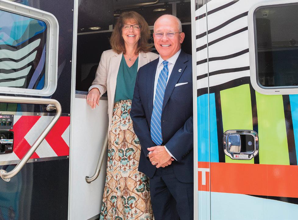 In June, CHKD celebrated 50 years of our Mobile Intensive Care Program and debuted a new ambulance, equipped to transfer both critically ill newborns and children of all ages to CHKD. The vehicle, which features the artwork of local artist OnieTonie, was purchased with help from Chartway Credit Union’s Chartway Promise Foundation. Shown below is Foundation President Christine Wilson and Credit Union CEO Brian Schools during a tour of the ambulance.
