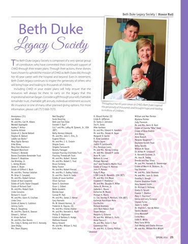 he Beth Duke Legacy Society is composed of a very special group of contributors who have committed their continued support of CHKD through their estate plans. Through their actions, these donors have chosen to uphold the mission of CHKD as Beth Duke did, through her 45-year career with the hospital and beyond. Even in retirement, Beth Duke’s legacy continues to inspire the generosity of others who will bring hope and healing to thousands of children. Including CHKD in your estate plans will help ensure that the resources will always be there to carry on the legacy that this inspirational woman began. Consider a gift through your will, charitable remainder trust, charitable gift annuity, individual retirement account, life insurance or one of many other planned giving options. For more information, please call (757) 668-7070. Anonymous (31) Lee Abdou Mr. and Mrs. Carl M. Albero Wendell Applegate Audrey F. Arthur Suzanne Artman Estate of J. Daniel Ballard Stephen B. Ballard Laddie Lee Banks* Mary Sigillo Barraco Erika Binau Mary Ellen Blackburn Margaret Blanchard Theresa C. Boneske Boone Charitable Remainder Trust Eleanor F. Bradshaw Joe Brinkley, Jr. L. Ashley Brooks James E. Bryan Estate of Clifford C. Bush Mr. and Mrs. Thomas Callahan Mr. Brian J. Campbell Mr. and Mrs. Robert Carlson Estate of Azel Carpenter Estate of Curtis Taylor Chappell Estate of Richard Clark Mr. and Mrs. Robert Clark Linda Consolvo Richard H. Couch Mr. and Mrs. Glenn R. Croshaw Linda Cross Estate of James G. Cubbison Johnny Curtis Mary A. Daughtrey Mr. and Mrs. David A. Dawson Edward L. DeFord H. Vivian DeFord Mr. and Mrs. Ron Dennis Drs. Craig S. Derkay and Kris E. Kennedy Jane Dilday Mrs. Dawn Dippery