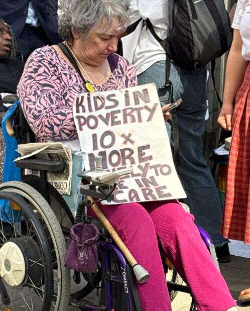 Claire Glasman, from WinVisible and a member of ALLFIE’s Stronger Voice steering group, addressed the crowd with a speech highlighting the intersecting lived experiences of Disabled mothers and their families. Around her neck, she wore a placard that read, “Kids in poverty 10x more likely to be in care,” drawing attention to the damaging impact of current policies. Her message strongly echoed the focus of ALLFIE’s Stronger Voices project, which addresses the intersections of segregation, disability, and poverty.