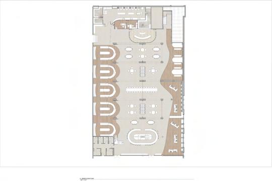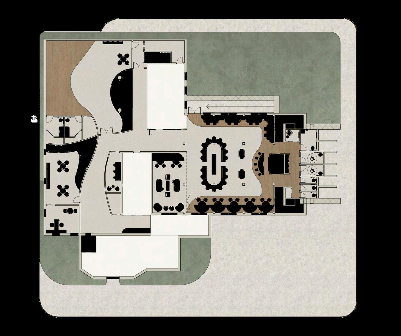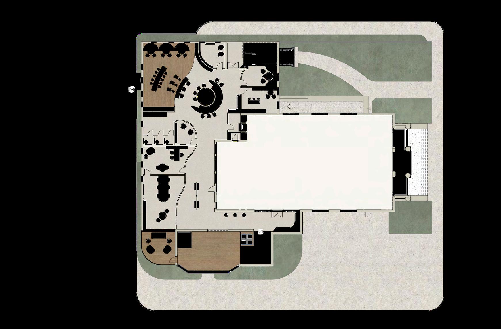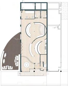 The space plan for the healing center is meant for its staff to be able to have visual access to their patients at all times. The staff desk is partly wrapped around the medicine room and charting area for maximum eyesight. All walls represent curves and align with the shapes of the fungi studied. The courtyard path as well as the ceiling elements follow the gills of a mushroom tying in the concept to the design.