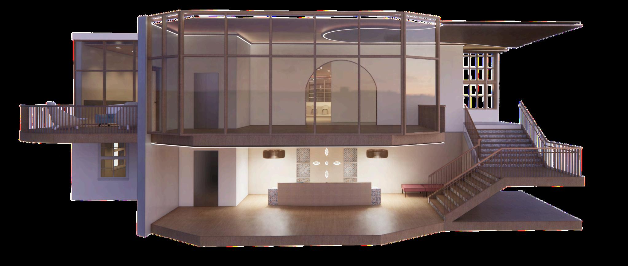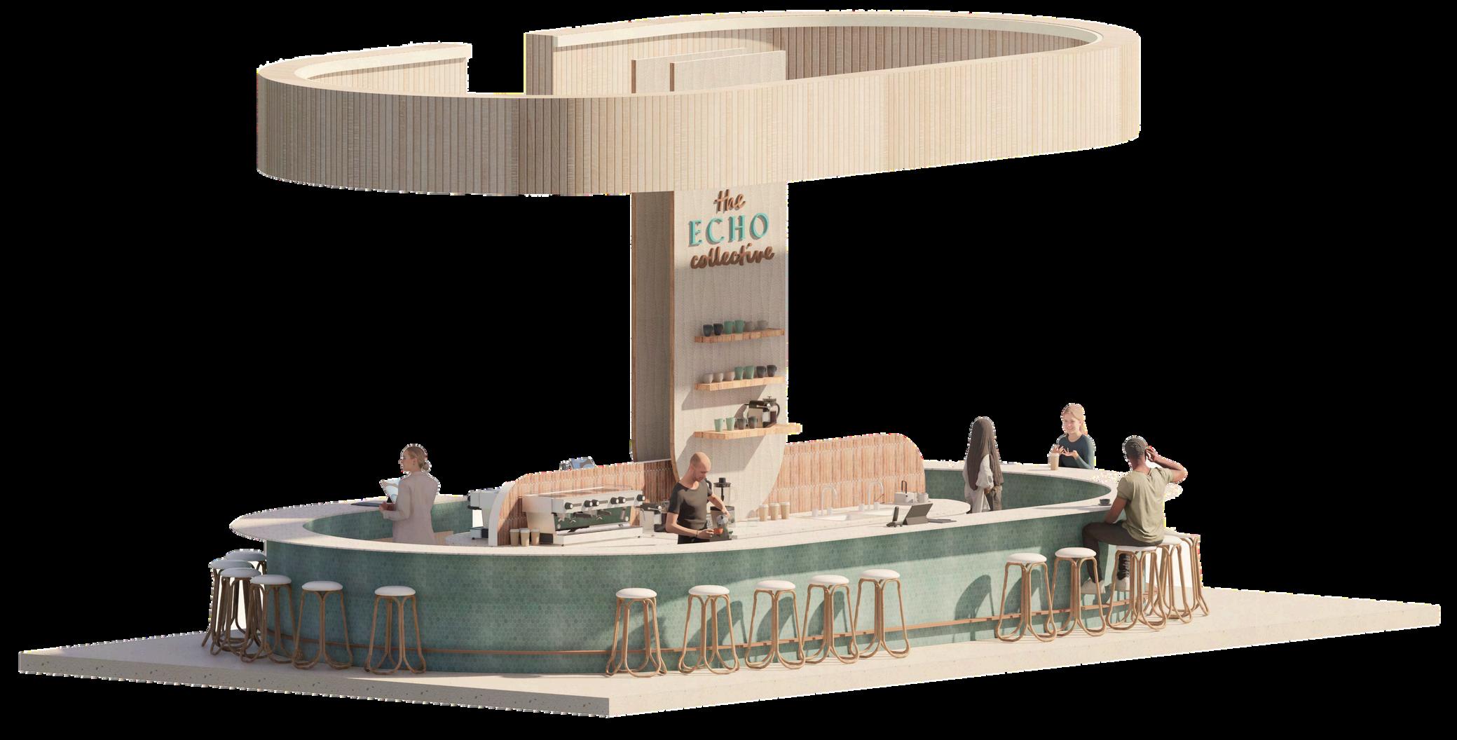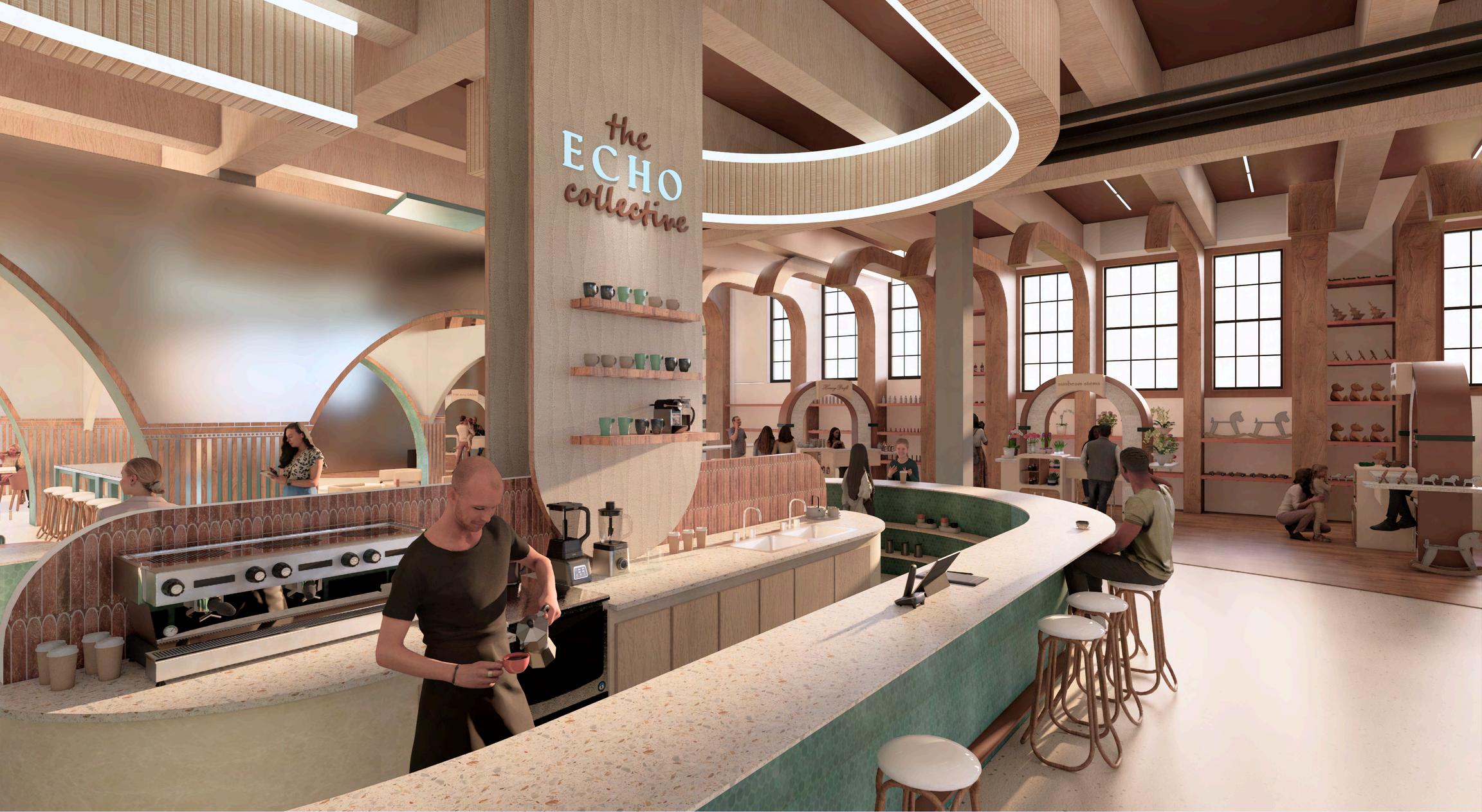 The Echo Collective is a venue where history resonates into the present - a space carved by the rough legacy of a working Navy Yard, now softened into a place of connection and creativity. Like the echo of one’s voice, the past shapes every curve, gathering, and shared story. The industrial bones remain, yet they are transformedthroughthe layersofhistory. CONCEPT