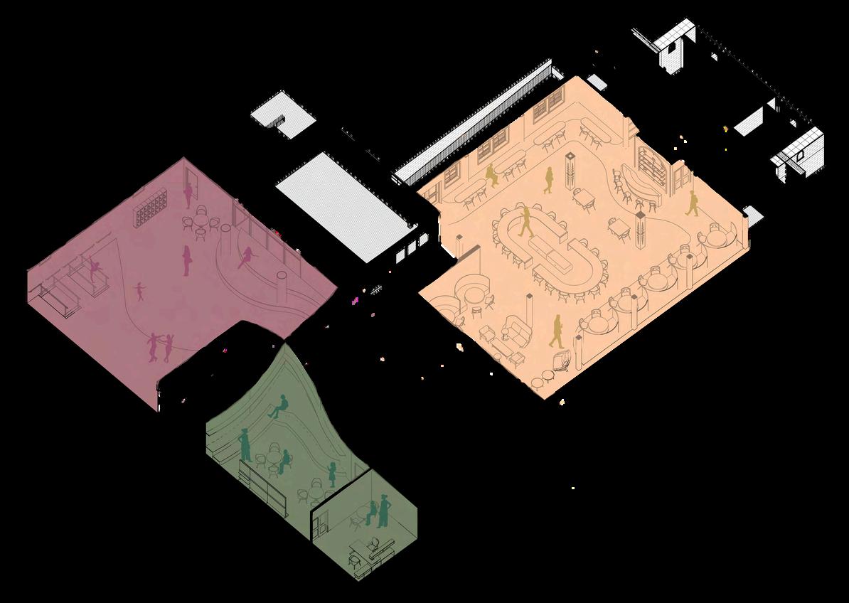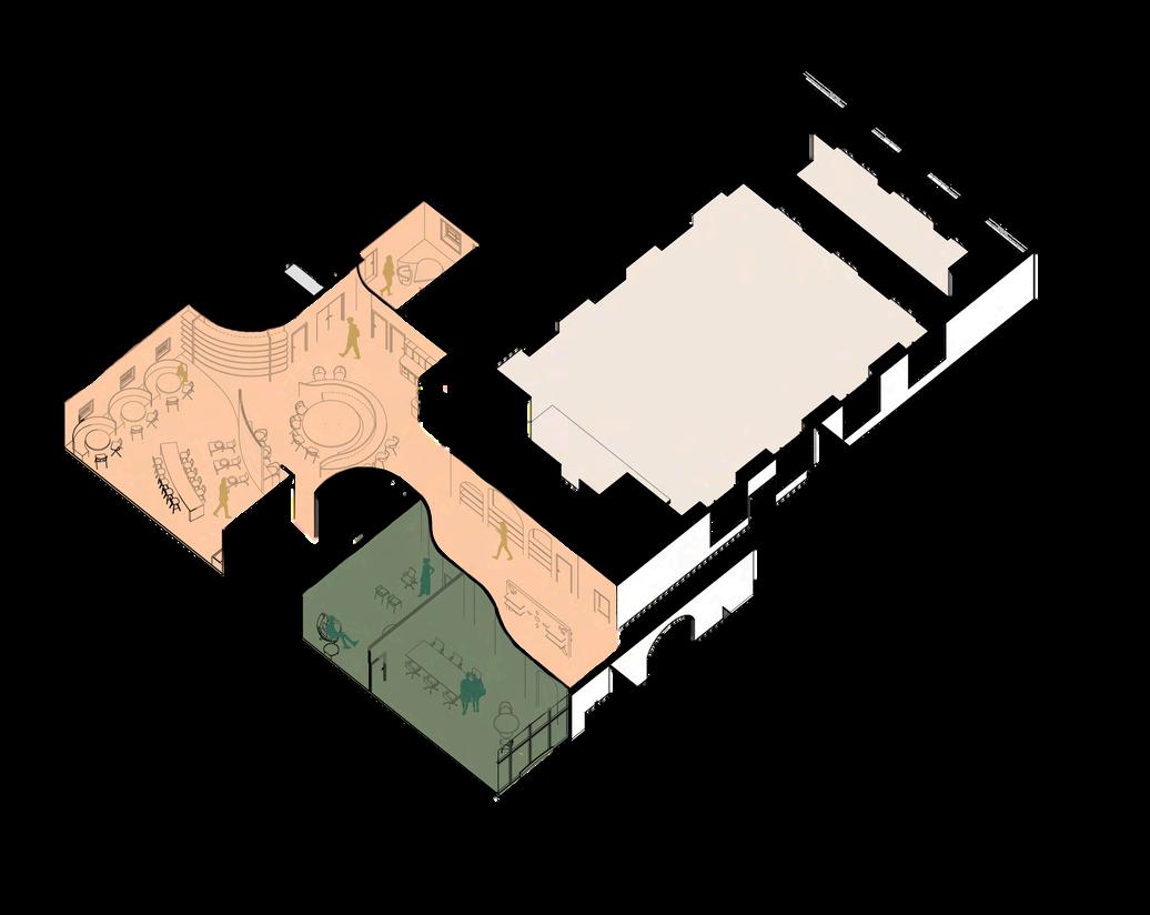 The Vivid Assemblage is a historic building in Akron - home to many different uses in its past. It stands grand in the main market historic district close to libraries, clubs, theatres, museums, etc. This projects focus was to renew this building in an area that was affected by the Innerbelt’s destruction in Akron. As a studio, we were asked to bring life and hope to a group of people that had seen much damage and heartache. A place to come together and talk - being able to express one’s opinions and create ideas for change. The Vivid Assemblage is just that. This building brings opportunity with inviting vendors to sell products, allowing a free rented space for at home bakers to use the café, and a podcast area for people to get their voices heard. The use of curves and bright colors, brings a senseoffluidityandopennesswhereeveryonecanfeelwelcomeandsafe.