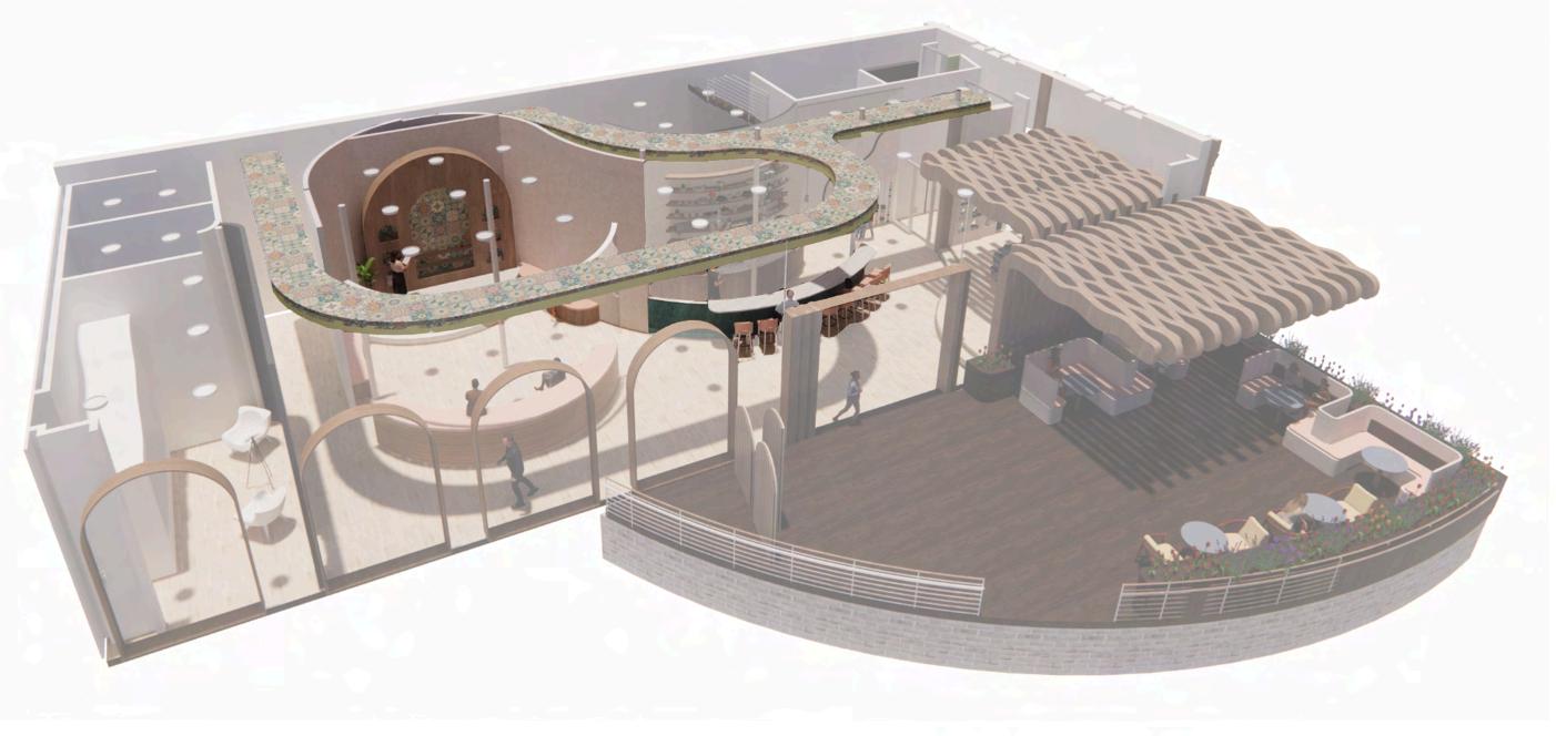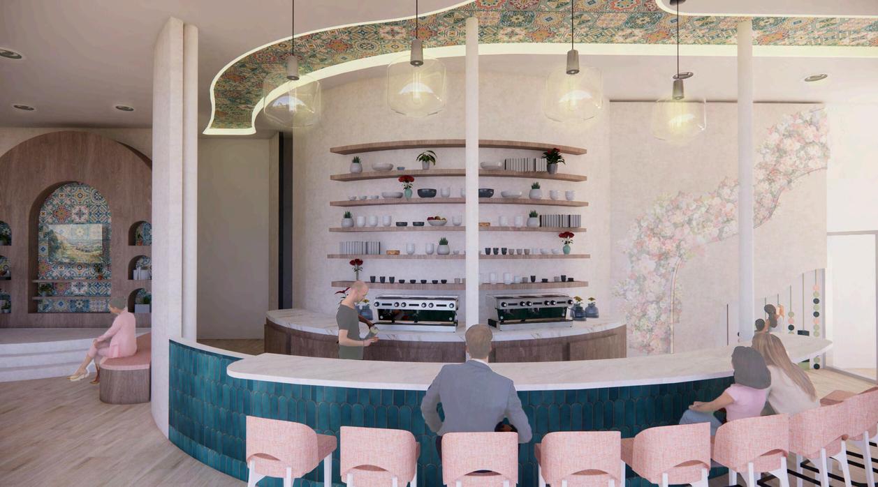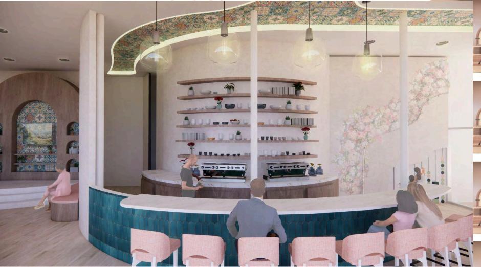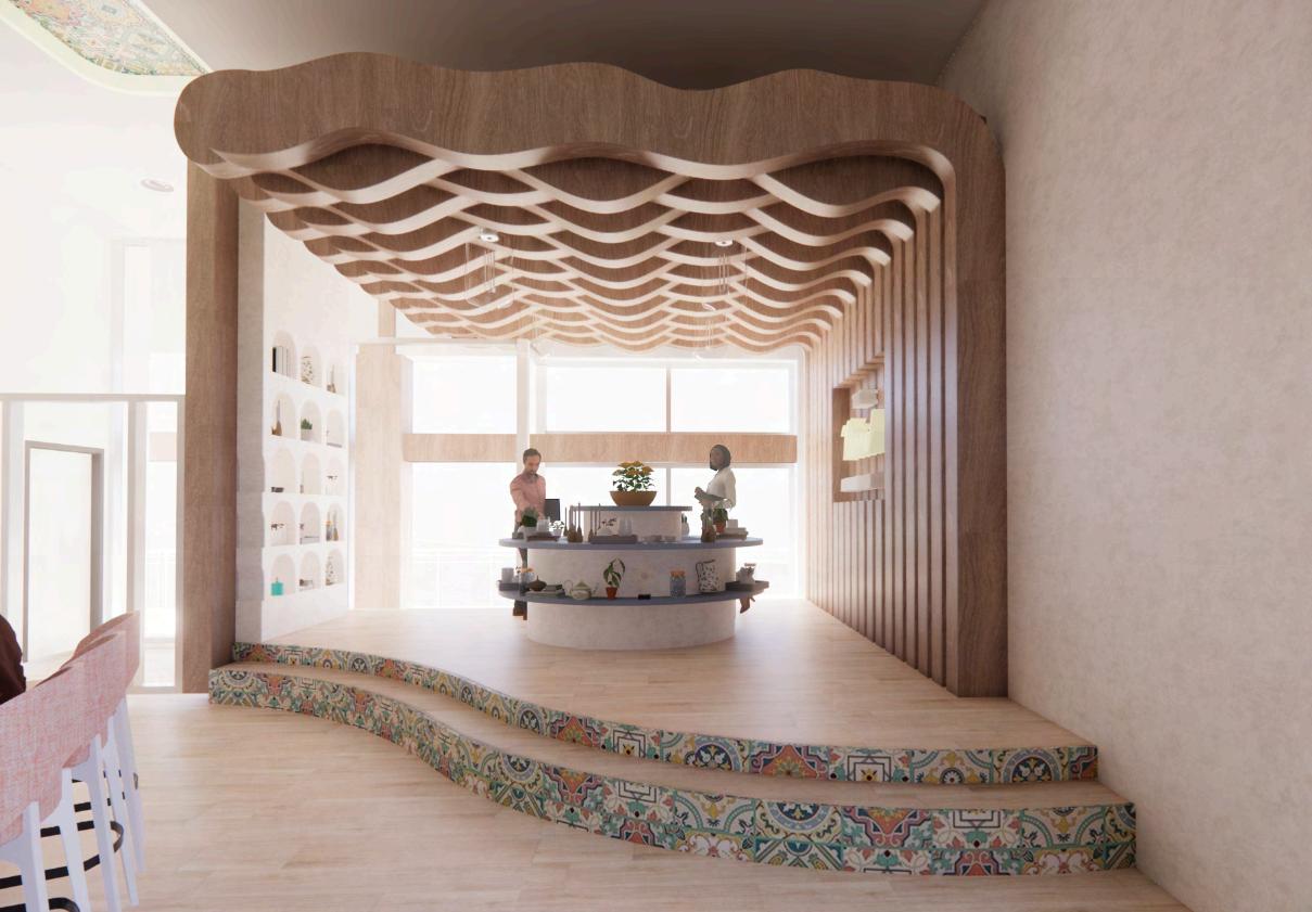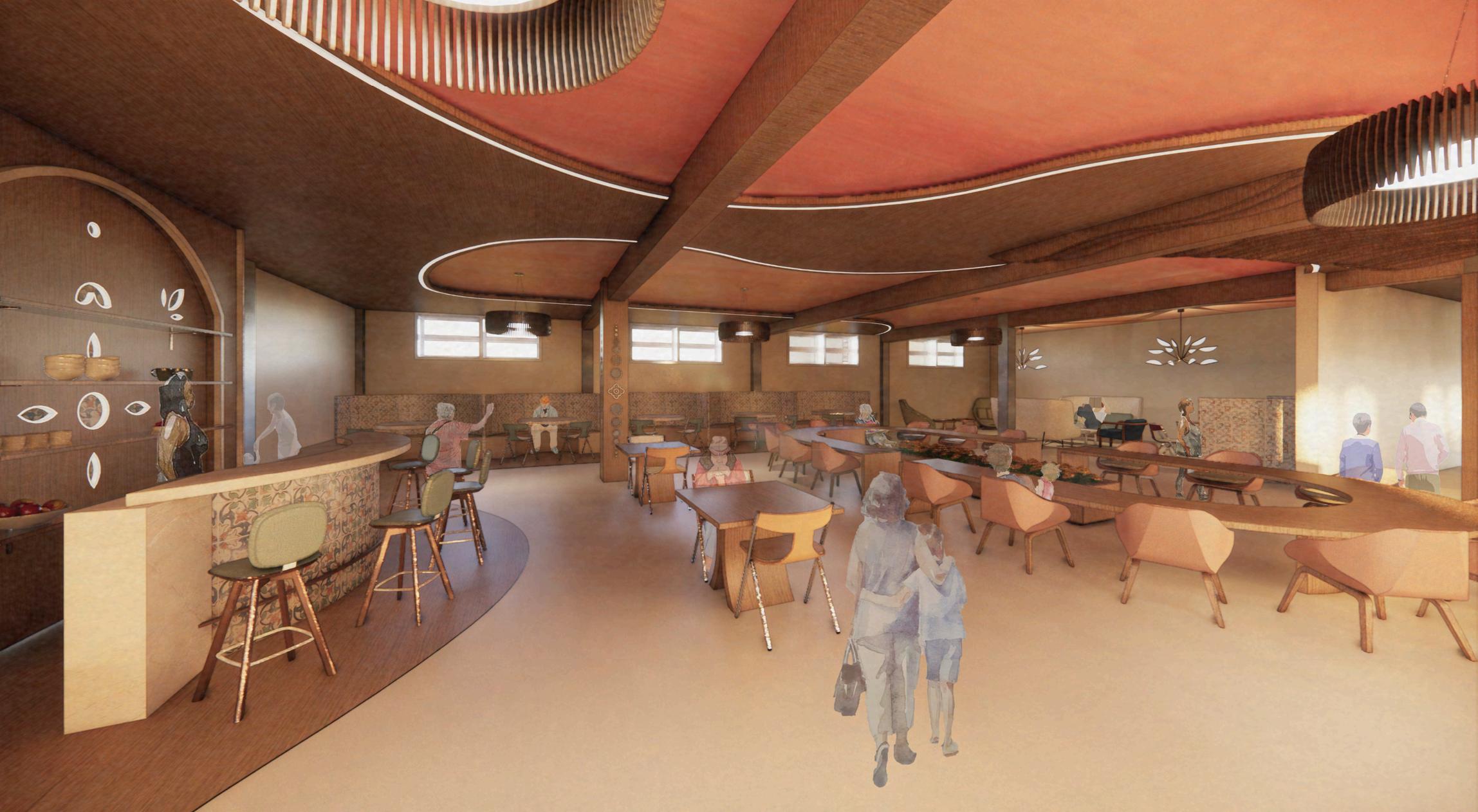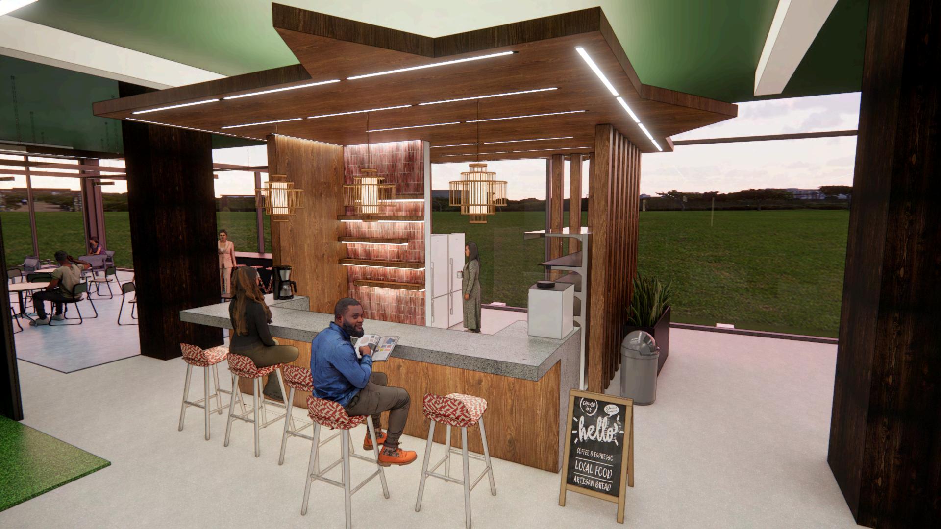 This café space is designed to be playful and open. The idea was for the café to flow into the rest of the space - connecting from the vendors to the outside space to the discussion area. Those who are in the beverage or bakery business but are unable to afford a building to do business, can rent out this space for free to be able to give business back to community members.