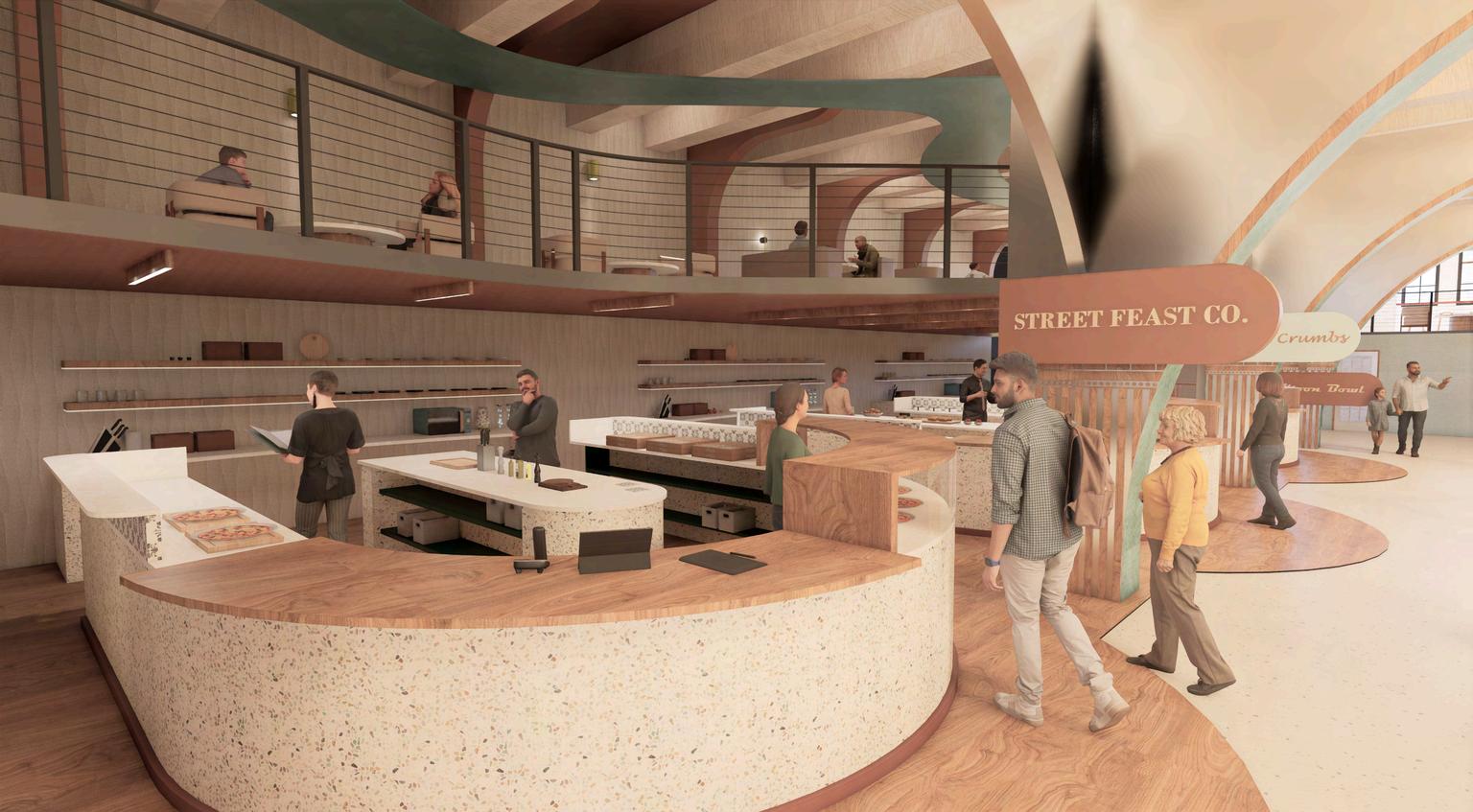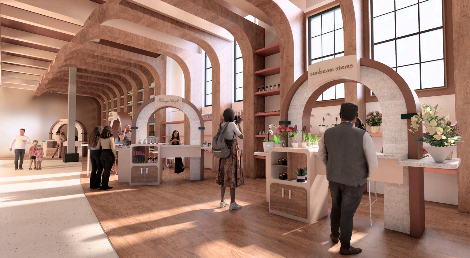 The food vendor space is one of the most important areas in this building. This is the heart of where visitors can connect through different cuisine. These vendor spaces were designed with transparency, repetition, and an open concept in mind. Additions of the food displays draw curious eyes, and the open hanging shelves in the back can allow for vendors to keep supplies.