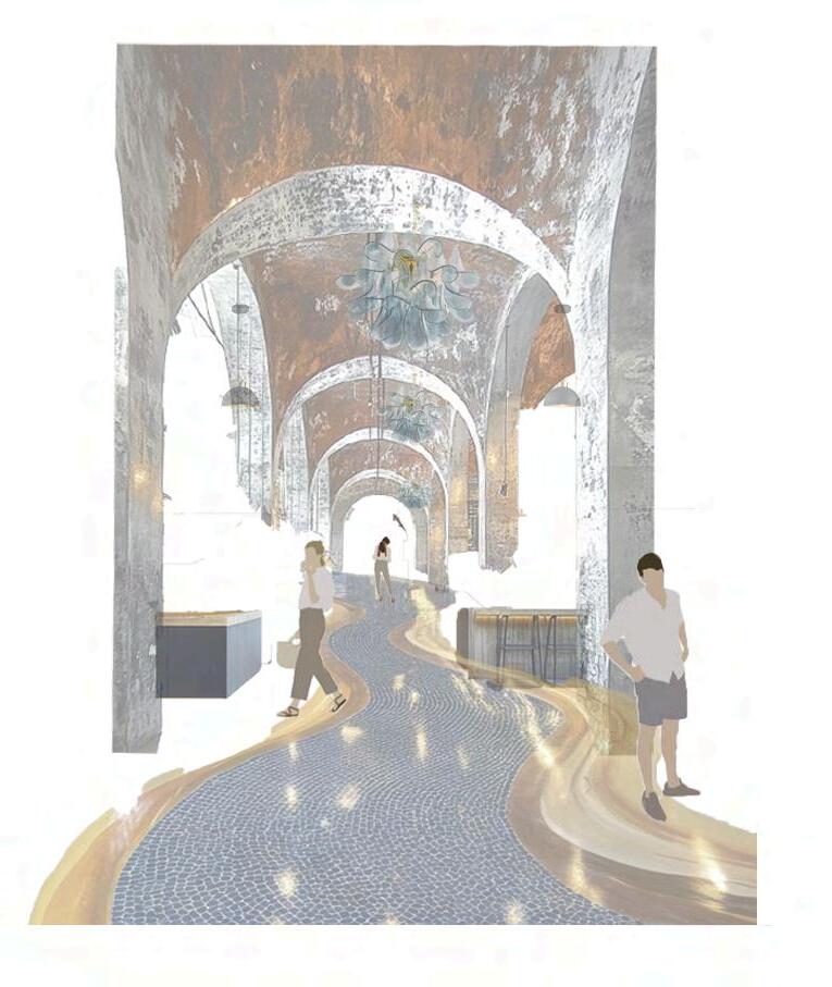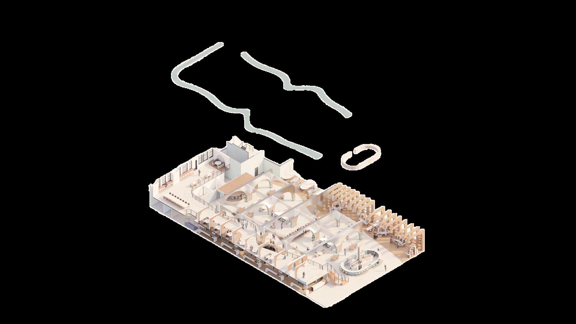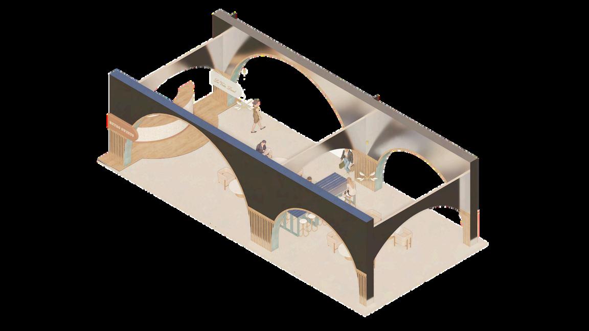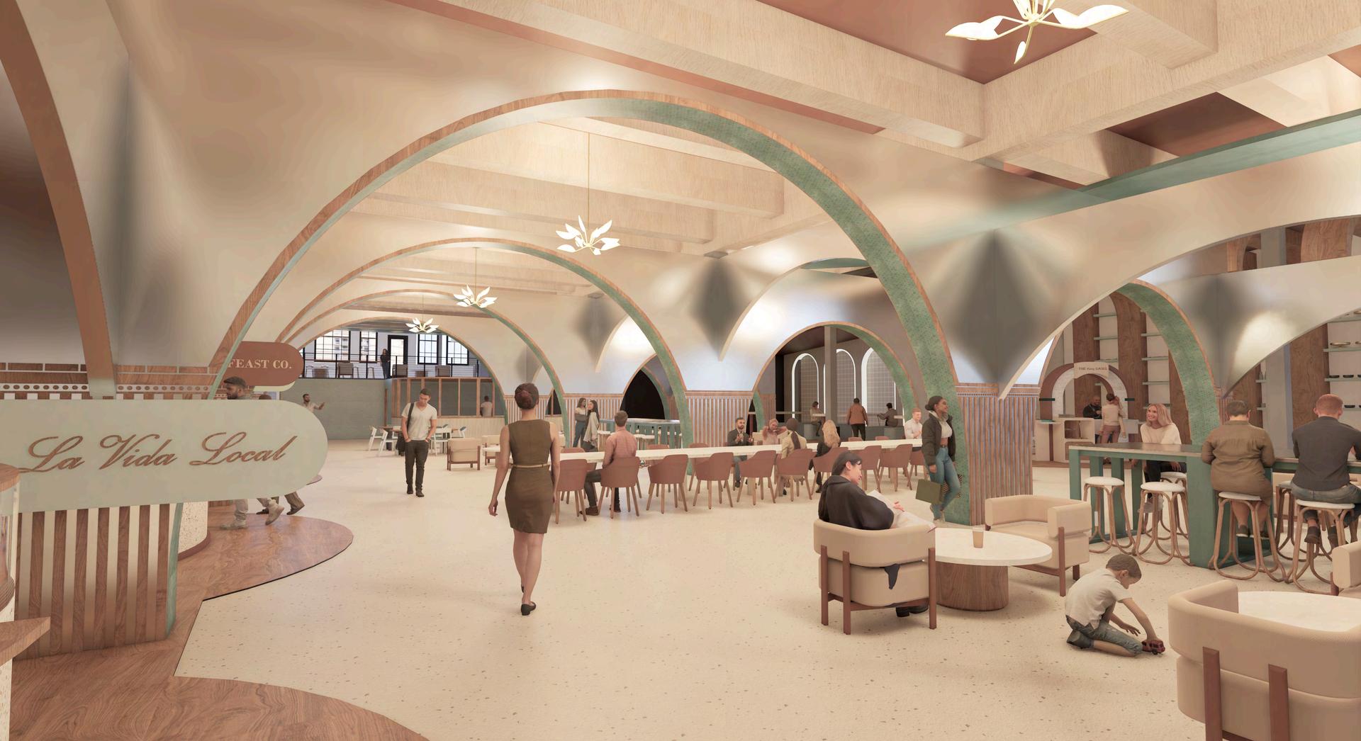 As an adaptive reuse project, our goal was to create a food market within an old Navy Yard building in Washington, DC—redesigning the space while preserving its rich character. Firstly, we went through studies and research in order to understand the human experiences that were related to the Innerbelt. We could then begin the design process with a good foundation. Through the repeated use of arches and curves, The Echo Collective brings wayfinding and conversation into the otherwise rectilinear interior. Reflections from mezzanine and floor changes, inspired by the Anacostia River, guide the eye through the space. An open floor plan fosters community connection and supports vendor and pop-up interaction. Interlinked levels and archways offer visitors personal, unique experiences. A palette of blues and rusts—seen on the exterior—along with reflective materials, especially metal, allows individuals to see themselvesinthedesign,creatinganemotionalconnectiontothespace.