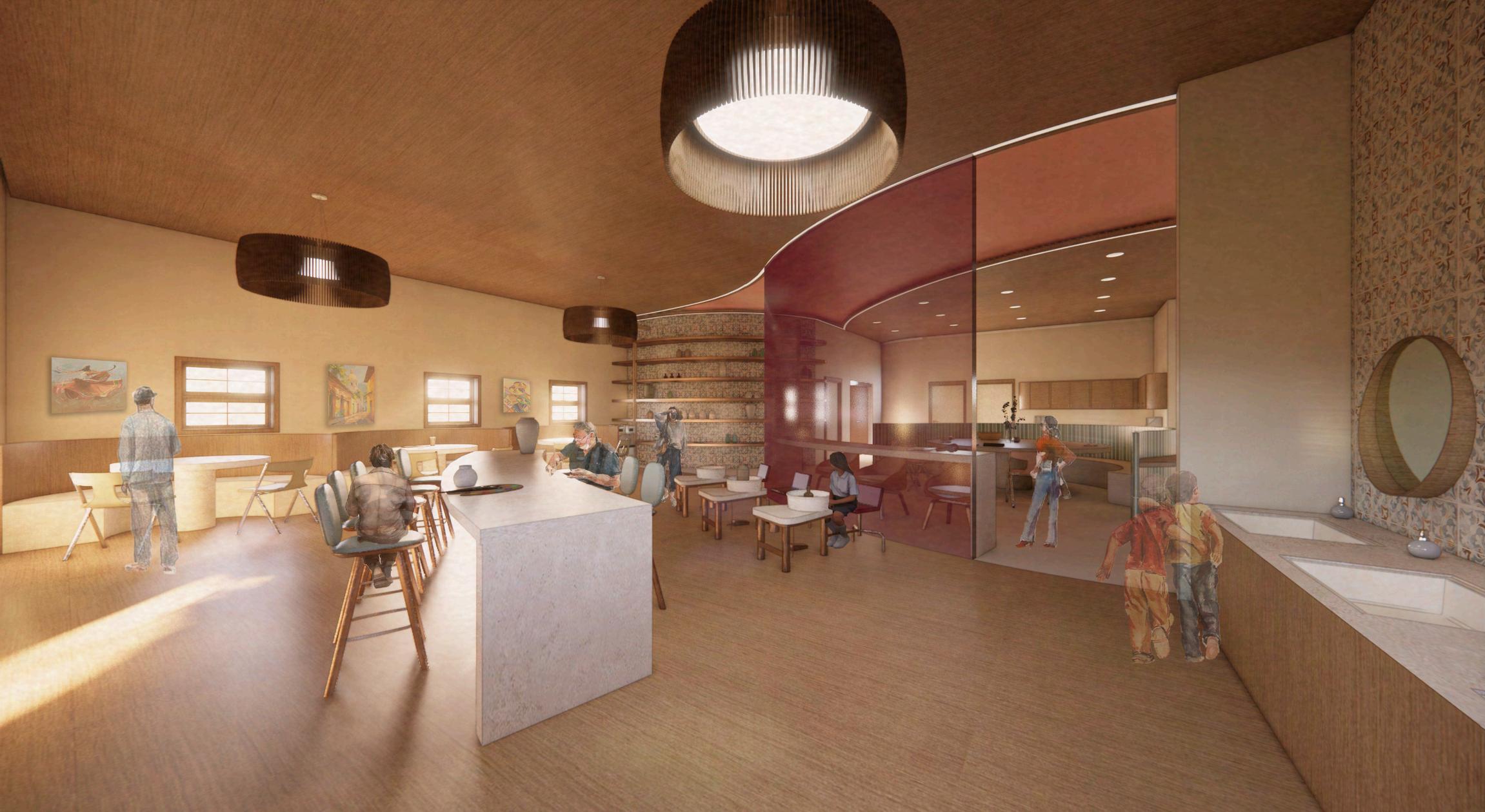Signs of Earth is a welcoming space rooted in the needs for art in the deaf communities. This is where members can feel empowered and noticed, connecting with friends and loved ones through visual and physical communication. This design is aimed to serve young adults in particular; with an emphasis on fostering a larger community of understanding and empowerment. There is a significance upon the fluidity and openness of this structure, not only for the sight lines and lighting for successful signs, also where the indoors and outdoors can merge into one. This pottery and ASL learning studio use natural materials in connection with the adjacent ponds that surround it, where water can reflect the flow and growth that is put into those who attend. Inside of this space, users can submerge themselves into beautiful projected installations where they are fully immersed in a visual experience, engage in hands-on pottery wheel classes, involve themselves in furthering their understanding of ASL, celebrating and observing expression through completed works of art, and ultimately engage in artistic communication. The integration of education and technology extends this studio’s potential, where there are more interactive tools and opportunities to enhance one’s senses. Signs of Earth studio showcases the priority of accessibility and inclusiveness, pushing theboundariesofcreativity,dexterity,andsenseofbelongingforall.