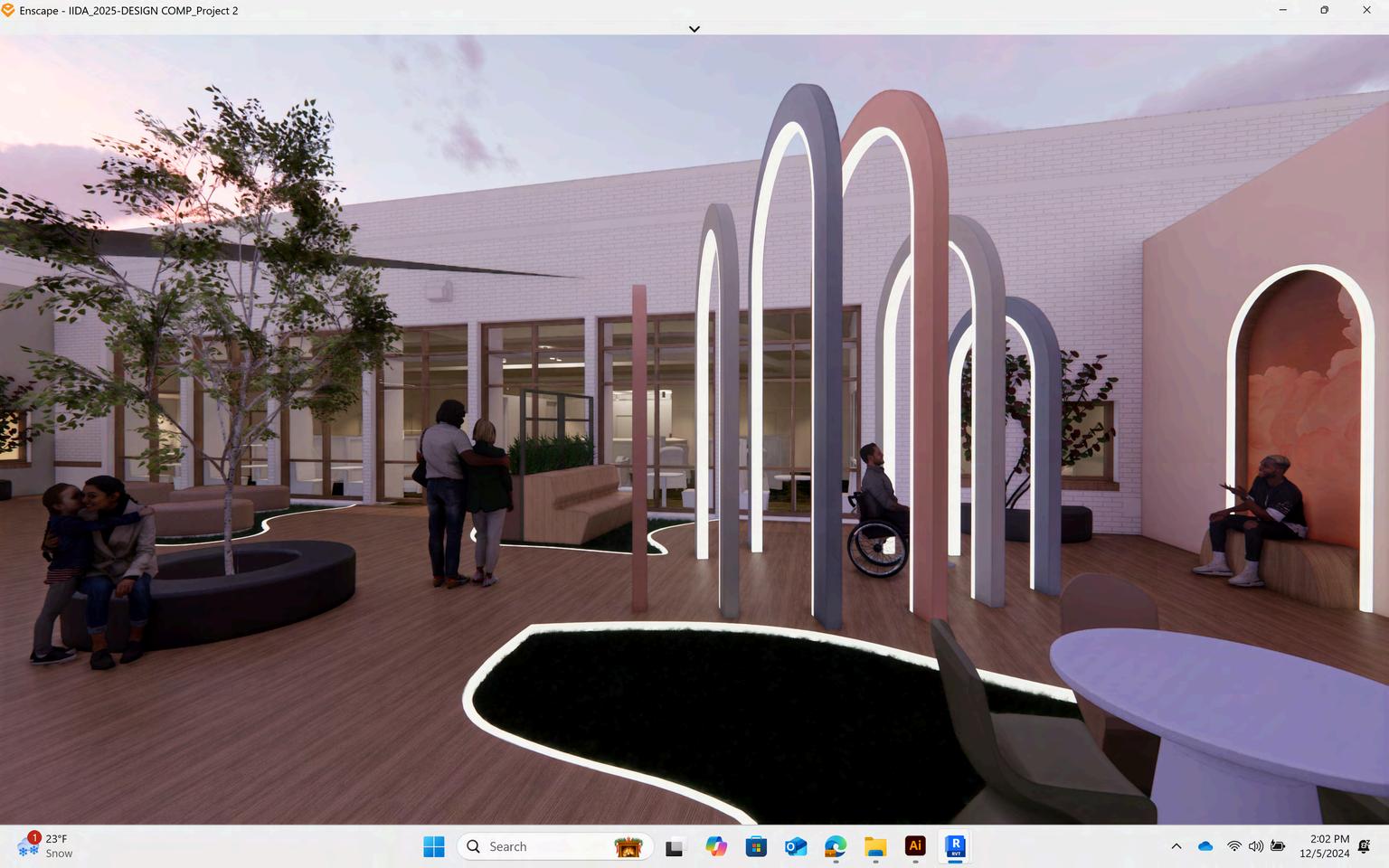 A courtyard area meant for roaming and thought. This space is peaceful and encourages those to meet with family and friends and catch up. The colors used here are fun and joyful, complimenting the built-in arched seating to the right of the rendering. Few vegetation and grass are added for connection to the outdoors and the arches and LED lights cause patients to have a personal experience within themselves.