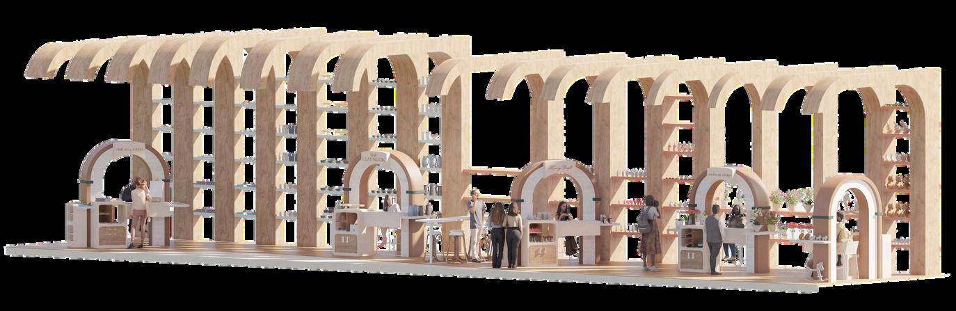 The custom pop-up designs are cohesive with the curved theme throughout the building as well as the shape of the wooden floor transition that is a reflected from the mezzanine. These pop-ups for different small businesses all have the same design but are completely customizable. Customsignsareamajorpersonalizationforthesevendors.