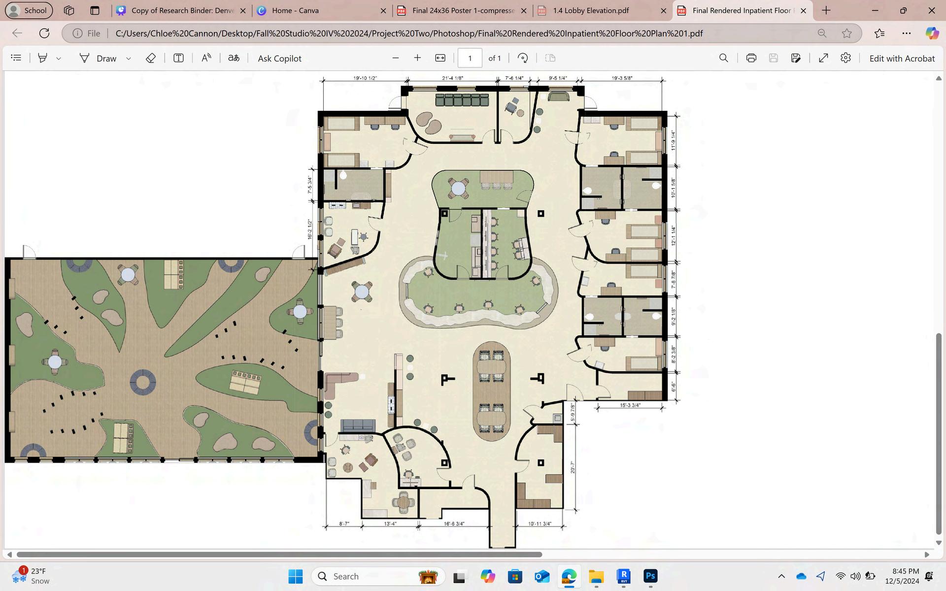 This project was sponsored by IIDA. The Fruiting Body Healing Center is a healthcare facility that helps those with mental illnesses. This center focuses on transforming these patients into their full selves, and healing what has hurt them in the past. This healing center is located in Denver, Colorado with a wonderful outdoor environment and gorgeous mountain ranges. With the idea of mycelium and fungi as a healing tool in medicine, the abstract parts of this specie were used in the concept of this facility. The shapes, colors, texture, and meaning of all kinds of mushrooms informed the way this project was designed. This space allows for its visitors to experience peacefulness and growth through becomingwhole.