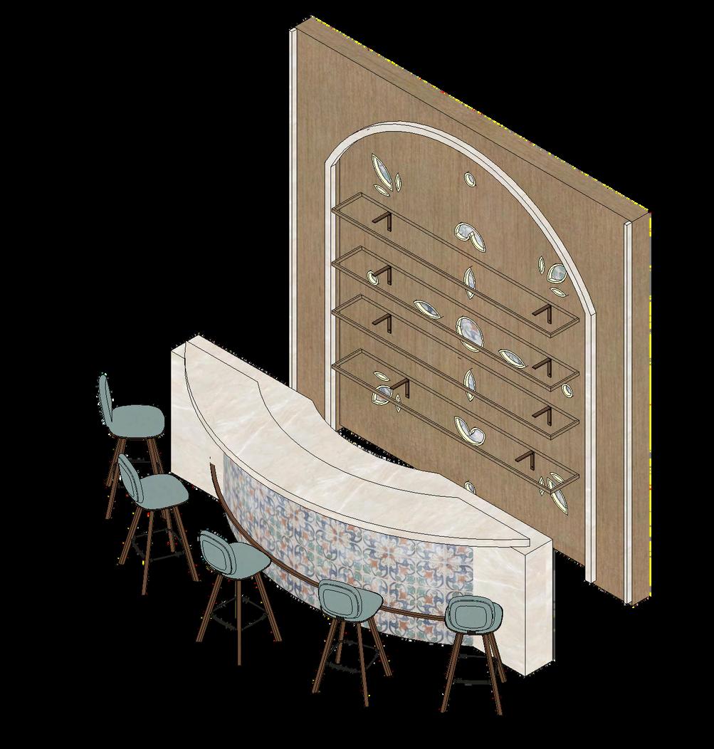 The center of this space is where you can really take in the arch structure that encompasses the room. The purpose of the archways was to create depth and dimension, as well as an interaction with the mezzanine. The use of a metal was to tie in the idea of reflection and being able to see a variety of light and shapes. Wooden intricate details line the bottom of the arches that add texture