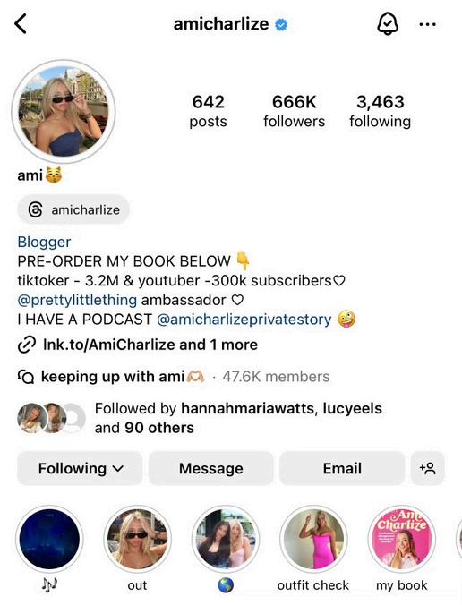 Her Instagram account , where she shares her daily lifestyle , her fashion choices , her brand collaborations and much more , has a total of 666,000 followers. She has created a community of people who all love and adore the same aesthetic and want to have the same or similar style to her. Her style and aesthetic reflect her identity perfectly and showcases how she acts and how she wants the world to perceive her.