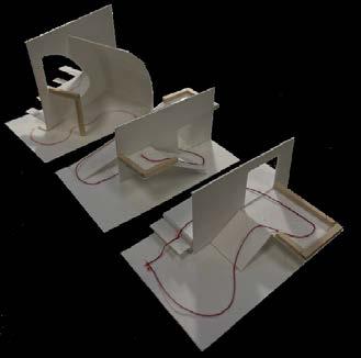 Began with trial spaces expressed with parti models. The final model was elaborated with use of perspective and elevation drawings.