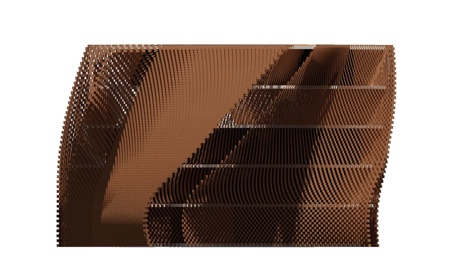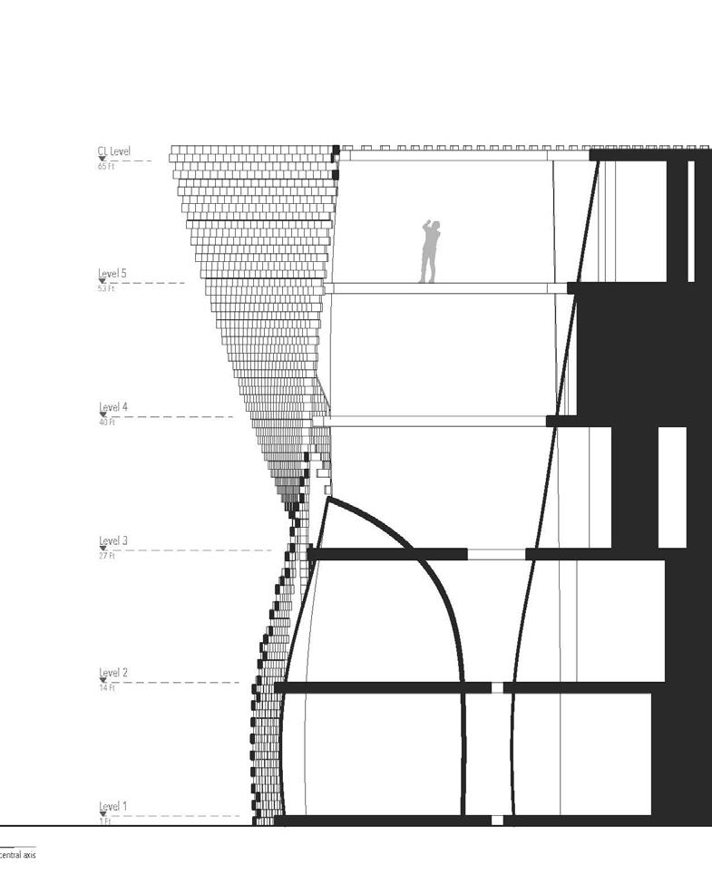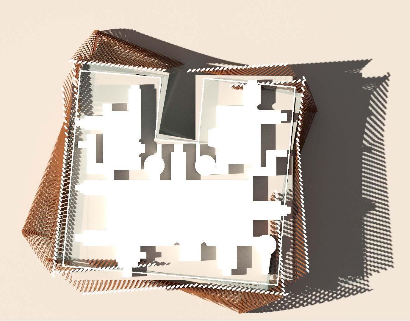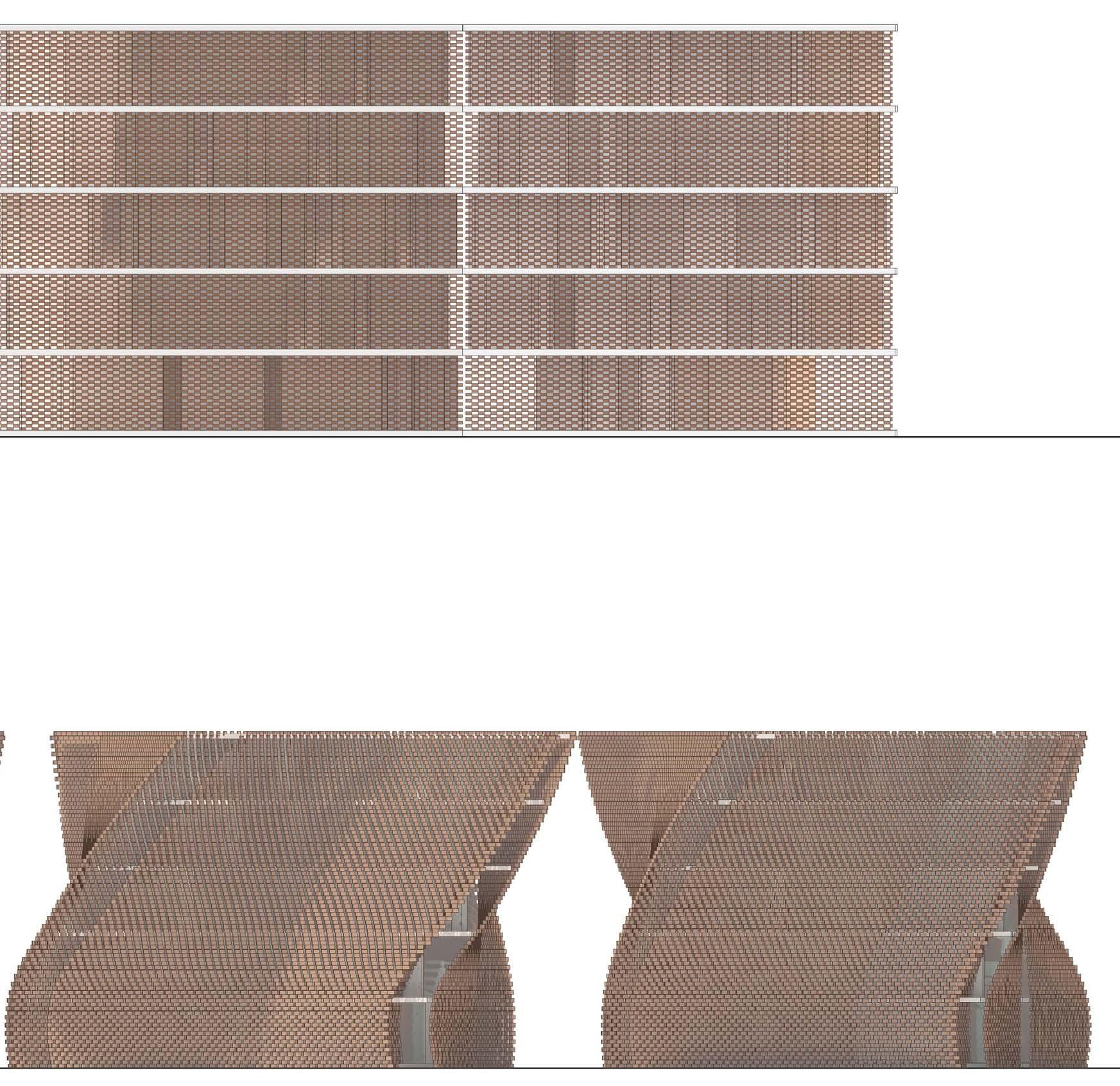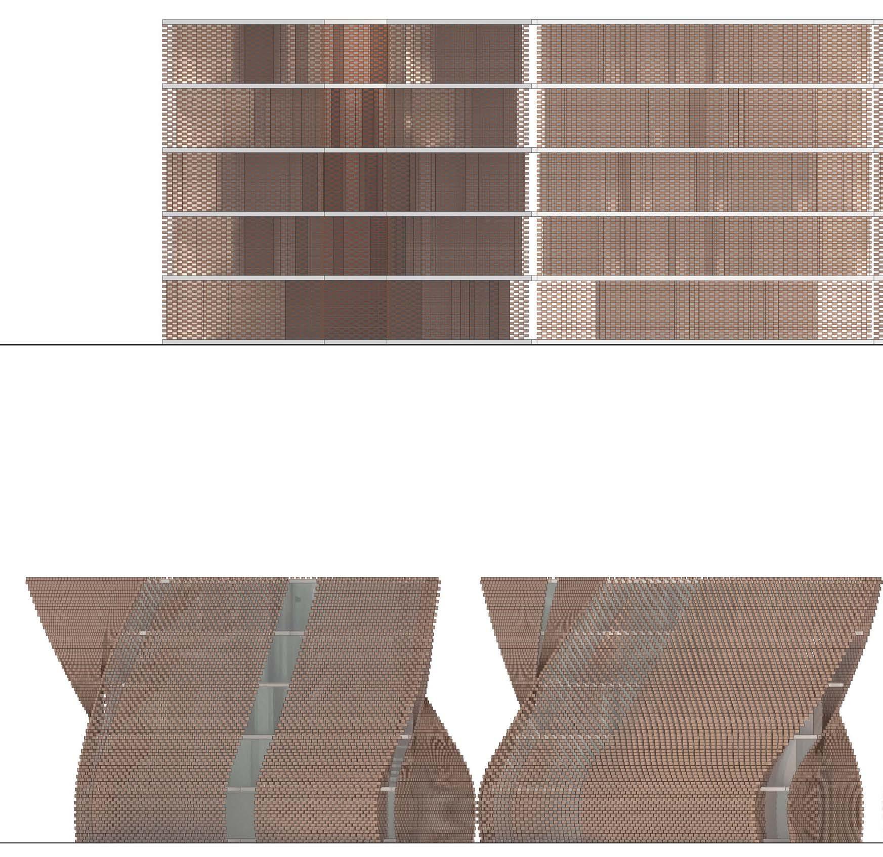 This unrolled elevation shows the deactivated versus the activated state of the structure, with the activated having a rotation in the massing as well as in the terracotta blocks of the curtain wall.