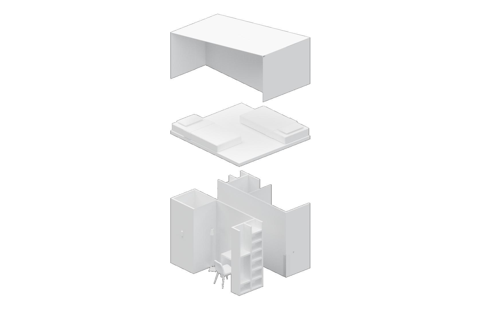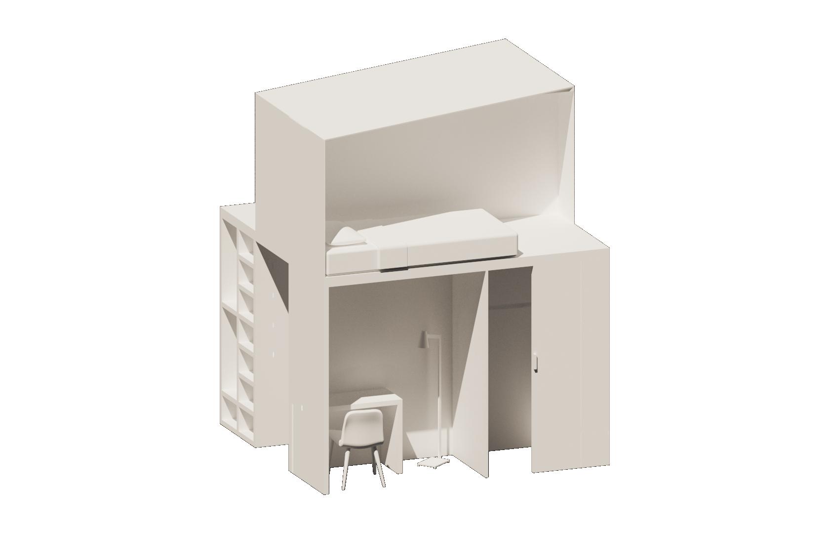 To the right is a multi-use piece of furniture I designed for the lofted bedrooms. The double bunk bed creates many spaces in one, a bed, desk, closet, and storage spaces. The two sides of the double bunk form a walkway in between giving access to spaces behind it, further breaking up the room into utilized areas.