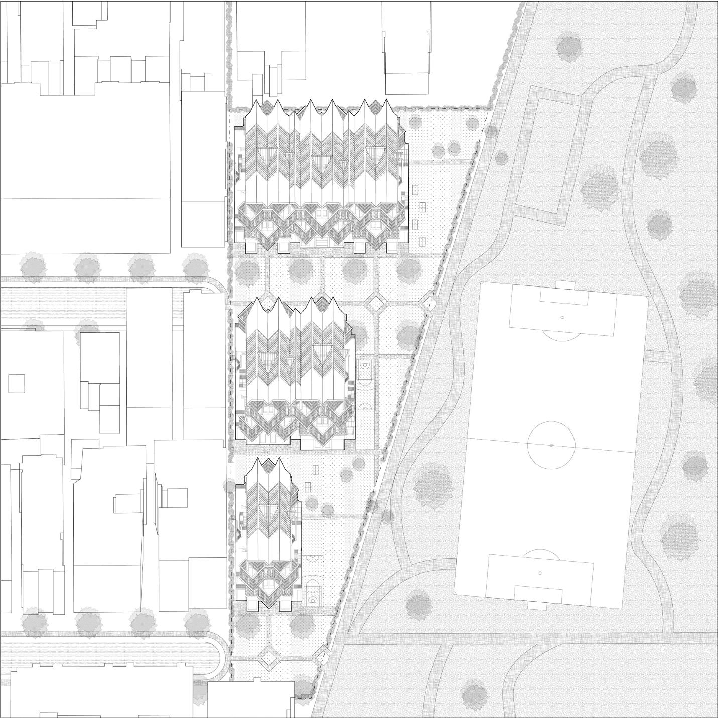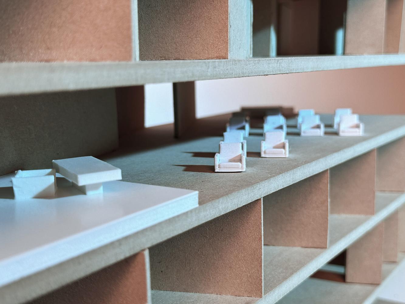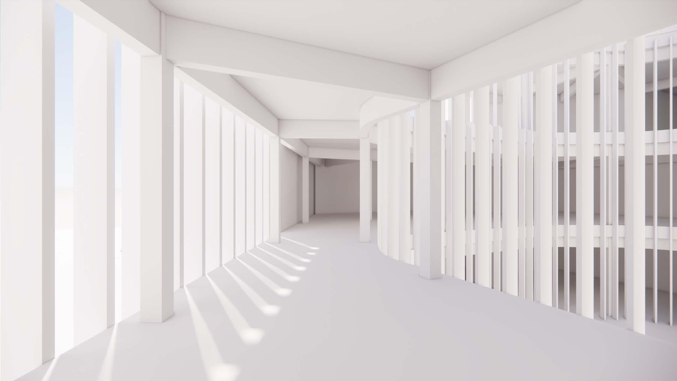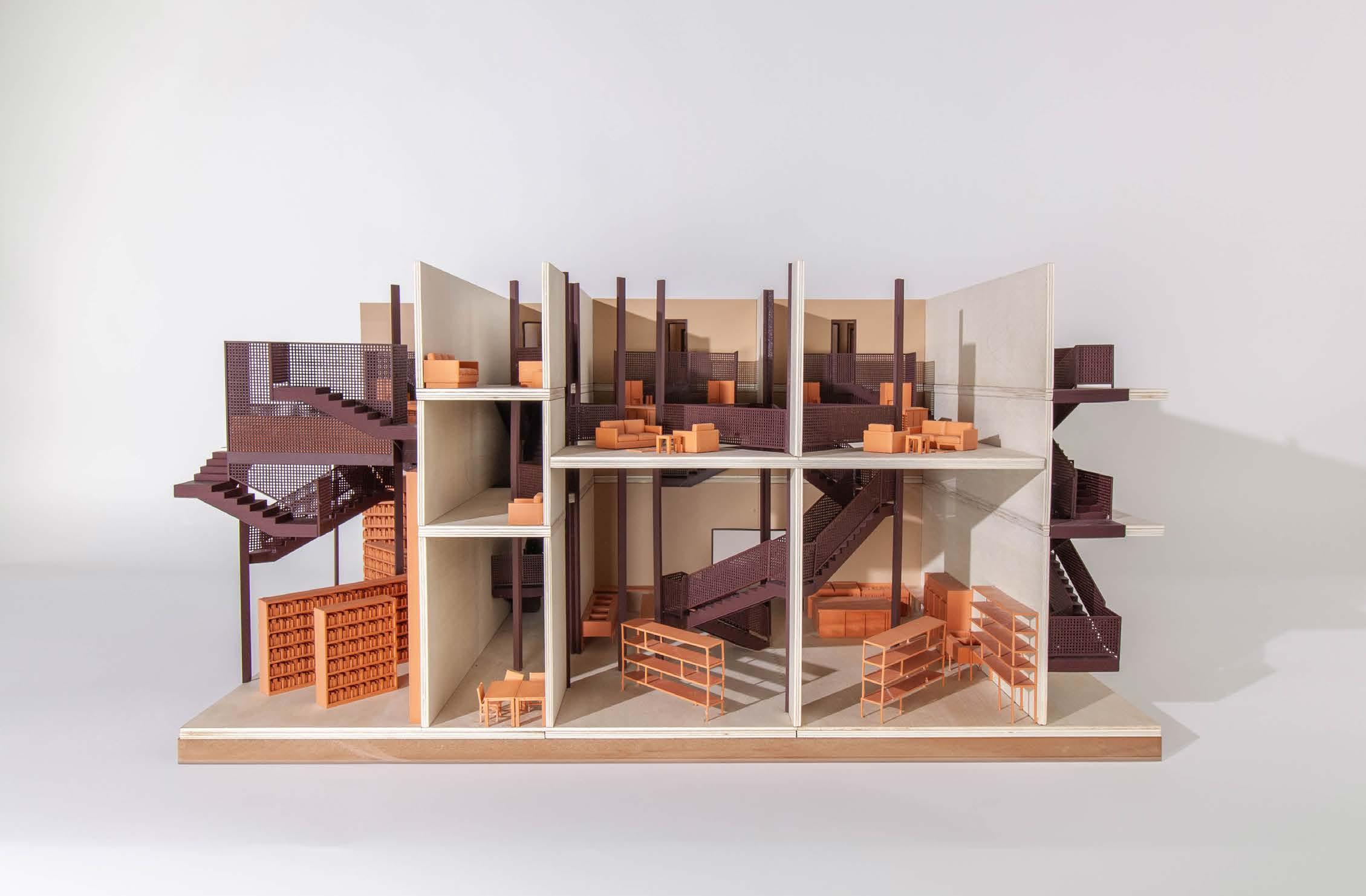 In superimposing Le Corbusier’s Unite d’Habitation communal housing project diagonally through an existing precedent building we sought to create a key of interlocking private and public spaces by retaining and reworking the sectional skip stop organization. Designed for art students, the building features interconnected bedrooms and communal kitchens, recreational facilities, studio spaces, and workshops, forming a series of co-living and work spaces. This creates a living room streetscape, intermixed with corridors that bring in light and poke holes to create signs of life.