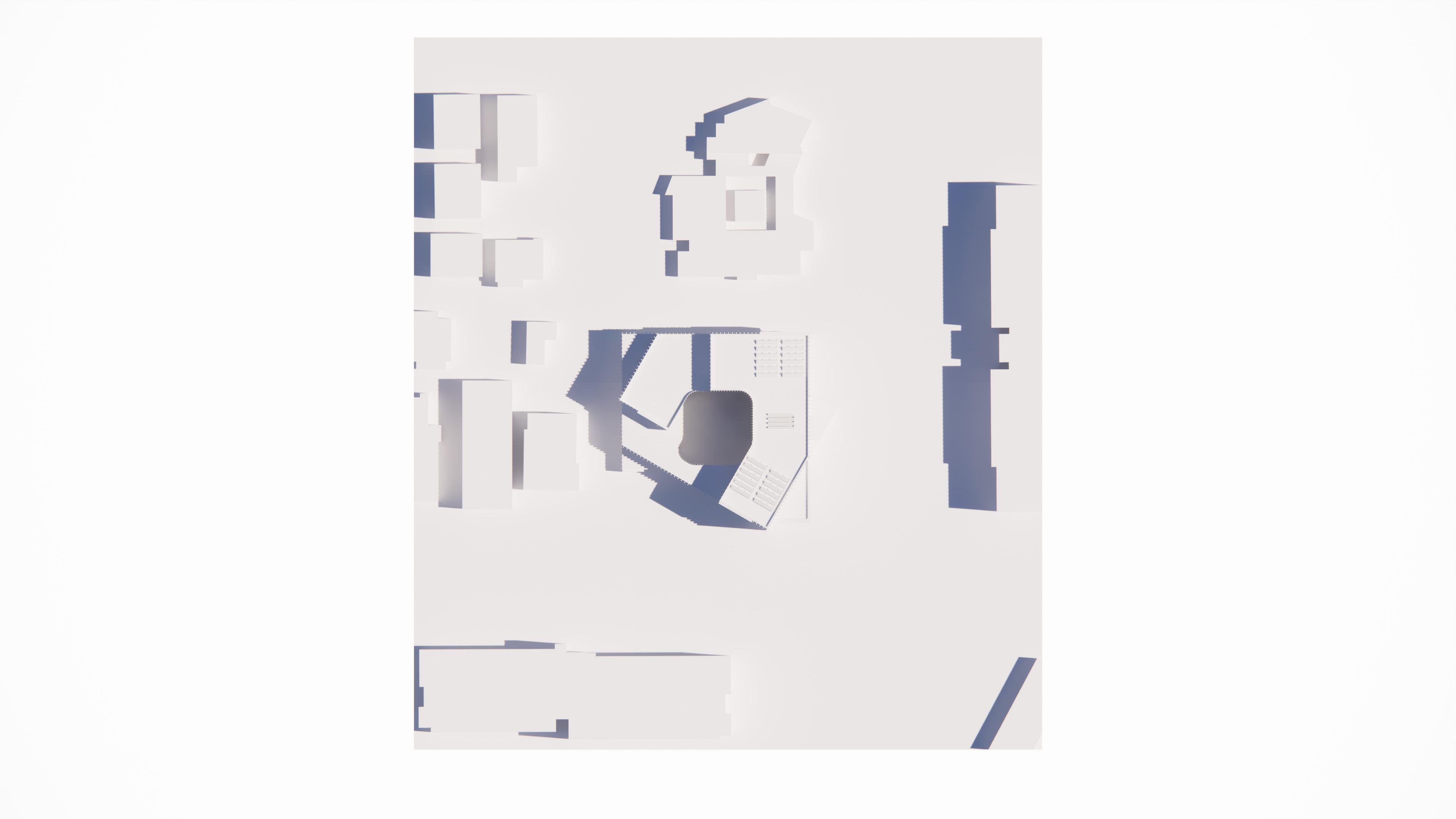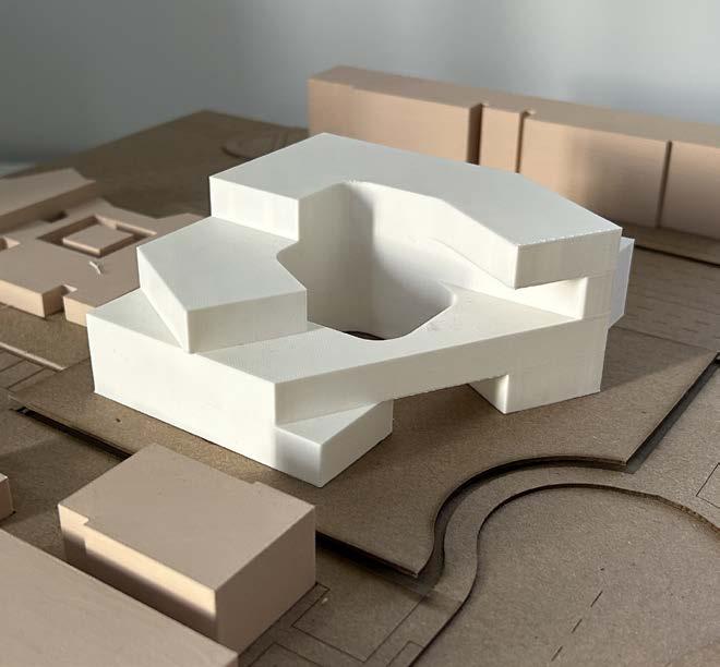 By constructing a series of three structures on the site, we were able to include multiple types of programming including a gallery space, lecture hall, and arts hub. We sought to produce similar qualities of space as the Serra sculpture does with our interest in interlocking and shifting curvatures and how it would feel to walk in the space between curves.