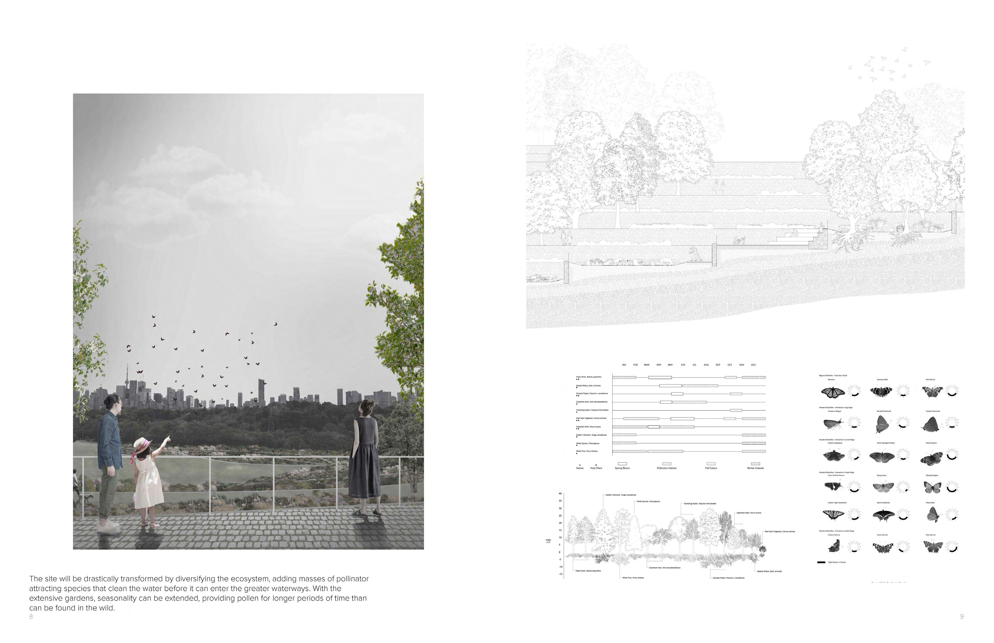 The site will be drastically transformed by diversifying the ecosystem, adding masses of pollinator attracting species that clean the water before it can enter the greater waterways. With the extensive gardens, seasonality can be extended, providing pollen for longer periods of time than can be found in the wild.