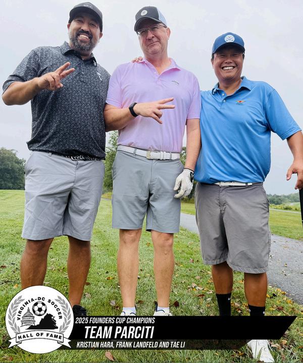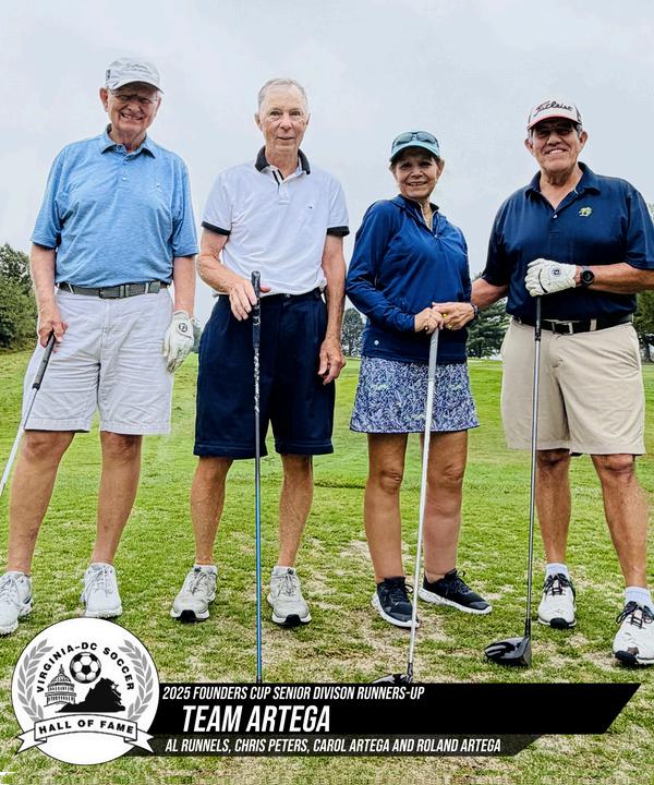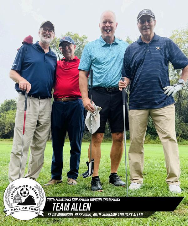 This year’s VA-DC Soccer Hall of Fame Golf Tournament was held on September 25, 2025 at the Pleasant Valley Golf Club in Chantilly, Virginia. There was a record number of 19 teams with 71 players competing for the Founder’s Cup. The weather again cooperated by suspending the rain during play. The players and volunteers enjoyed a continental breakfast and WAGS sponsored buffet luncheon during the awards and auction. Several WAGS representatives attended and volunteered as well and WAGS 50 sponsored a team again this year. Players represented several soccer leagues, clubs and organizations from across Virginia and DC. Team ParCiti won the Founder’s Cup and Team Allen won the Senior Division.