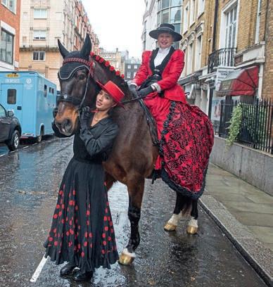 ClargesStreetis coming to life. Fromthe horseboxesandthegrey dayemergethe peoplewhowerewrappedin waterproofs,now dressedinthemostsuperb costumes,horses andriderstransformedfromtheordinary to the extraordinary.Elizabeththe Firsttrots past me, closely followedbya supremely colourfulhorse andriderwhosecostumeis completedbyahuge pairofwings. AsetofShetlandponiesstand by thehorseboxeswearingdungareesand yellow t-shirts,oh,not forgettingtheirspectacles.A setof Vikingsappearfromroundthe corner,and thena stepbackintothepast as asidesaddle rider completes apictureof19th century London. TheWorcestershireCavalrygatherinperioddress looking readyforthecharge, and abeautiful SpanishhorseandriderbringtheMediterranean sunshineon arainyday to West London.Riders