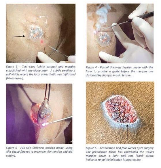 Traditional surgical excision with a scalpel blade and closure of the wound by stitching the wound edges back together has been associated with poorer success rates, it is thought that sarcoids seed tumour cells into the wound bed as they are removed, frequently leading to regrowth at the scar site.