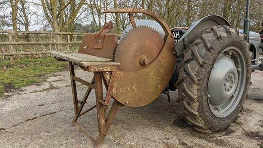 With permission sought, I trawled the internet and tractor magazines. As luck would have it, through a chance conversation, I found exactly what I was looking for, not too far away at a reasonable price. Once back home, I could take stock of what I had bought. It’s a later Massey Ferguson model in nice condition. It came with a belt, although this is too long and needs replacing. A farm spec modification has been made to enable adjustment to tighten the belt. The previous owner had fitted some extra guarding which was also a nice touch, so far so good. Everything turned freely by hand, so I decided to fit it up to a tractor and give it a run up. A dig around in the depths of the shed revealed a Ferguson belt pulley, so now it was just a case of hitching up. With a little persuasion, the sawbench was duly hitched up to my 1948 Fergie TEA20. With the belt tensioned, we were in business and it was time for the moment of truth. Now I have to admit, at this point I was rather nervous of the fearsome spinning wheel of death I had just fitted onto my tractor. So, it was with some trepidation I slipped the PTO into gear and gently let out the clutch. With a whirr we were off, leaving the engine ticking over I listened out for any odd noises or grumbles. All sounded good, so now I was feeling rather pleased with myself.